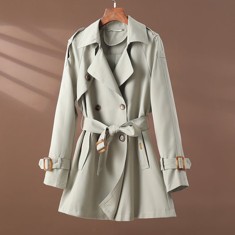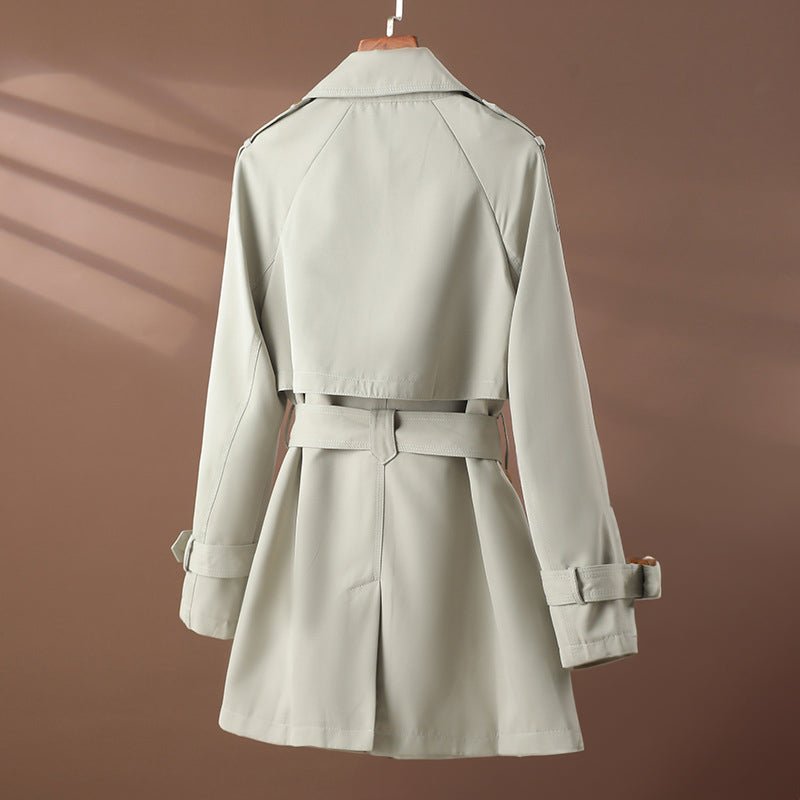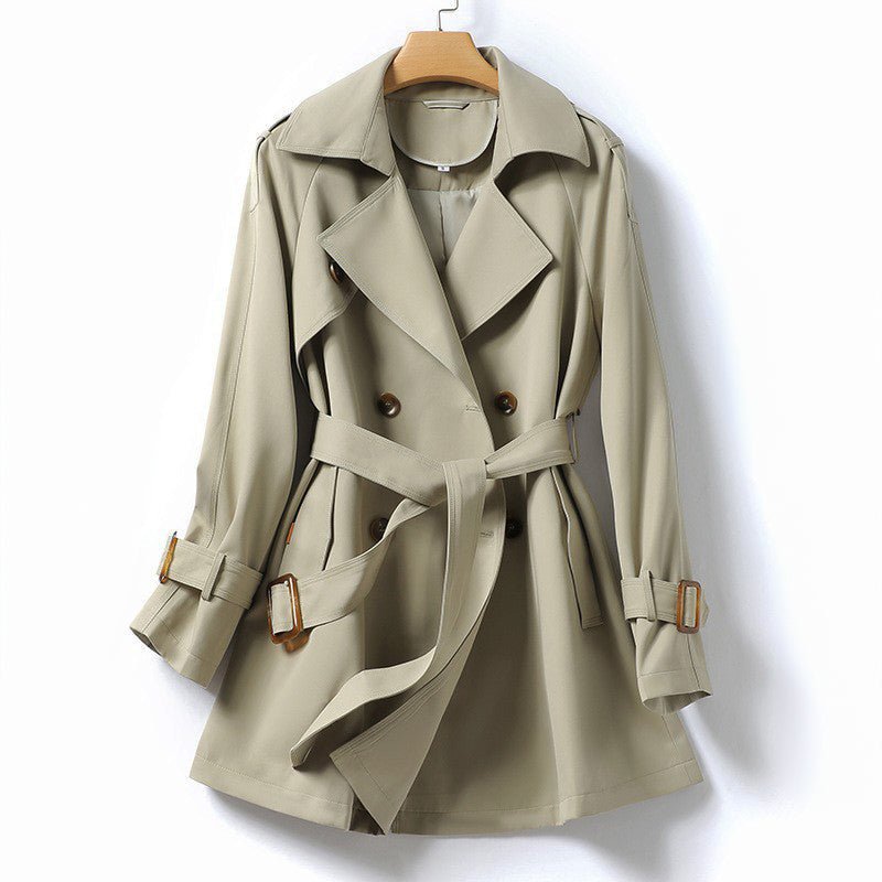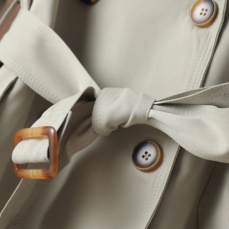 Elevate your style with the refined charm of the Amelie Cosmopolitan Trench Coat. This beige trench coat features a belted waist and a double-row button closure, offering a classic and sophisticated look.