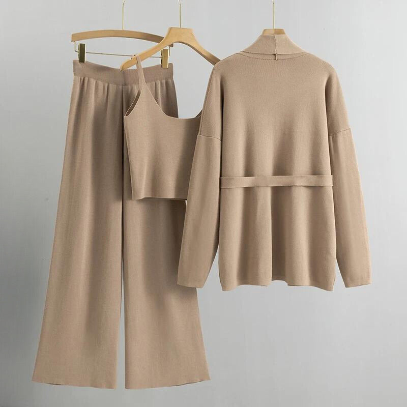- The set features a loose-fit cardigan, a cropped top, and wide-leg pants