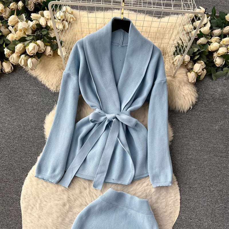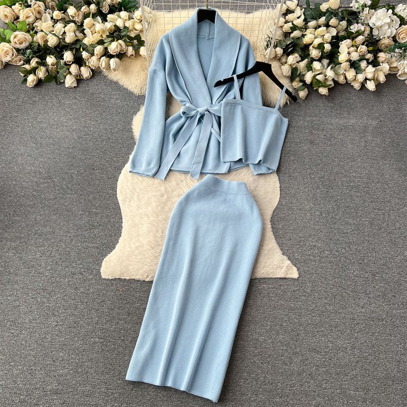 This charming ensemble features a midi skirt, sleeveless top, and cardigan, all crafted from luxurious baby blue knit fabric. The sleeveless top offers a flattering silhouette, while the midi skirt adds a touch of sophistication. Complete the look with the coordinating cardigan, featuring a stylish belt for added flair.