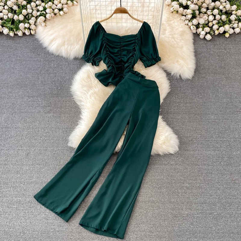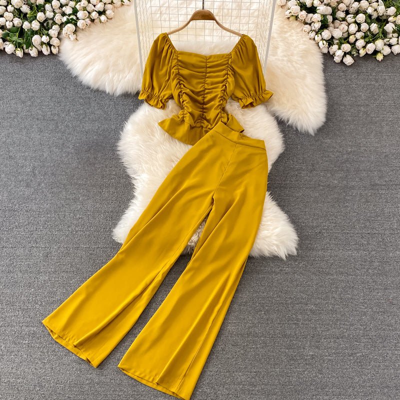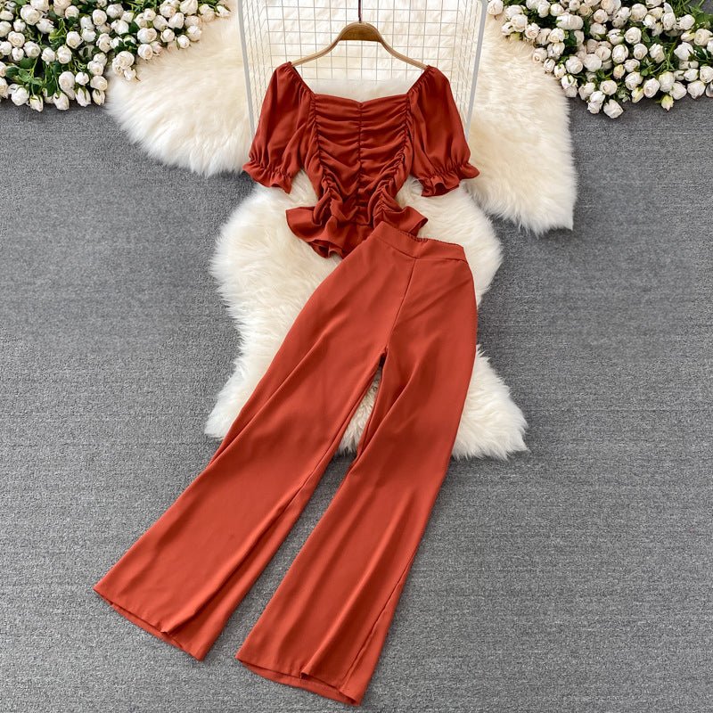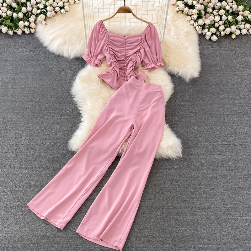 Immerse yourself in vibrant sophistication with the Amelie Fleur Charmaine 2 Piece Set. This dynamic ensemble combines wide-leg pants with a top featuring 3/4 sleeves, delicate pleats, and charming puff sleeves.