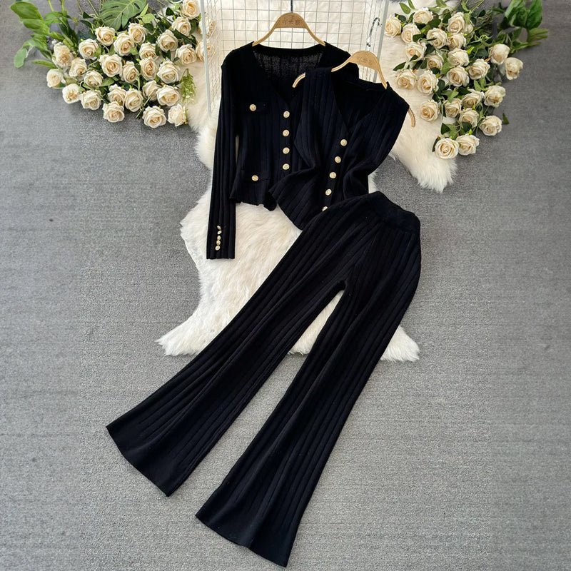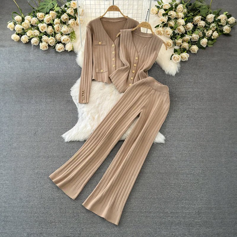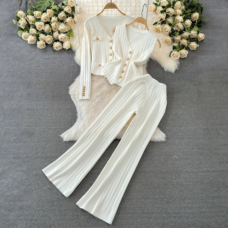 This trendy set features wide-leg pants with a high waist, a coordinating cardigan, and a sleeveless top for versatile layering options. Embellished with golden buttons as decorative accents, the Eden set adds a touch of sophistication to your look.