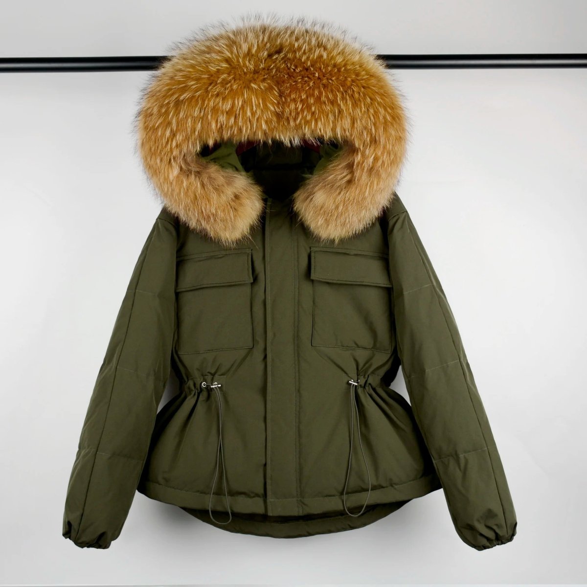 The luxurious fur collar adds a touch of glamour and serves as a cozy frame for your face, creating a statement piece that effortlessly elevates your winter wardrobe. The hood, designed for both style and practicality, offers additional protection against the cold.