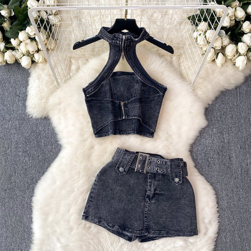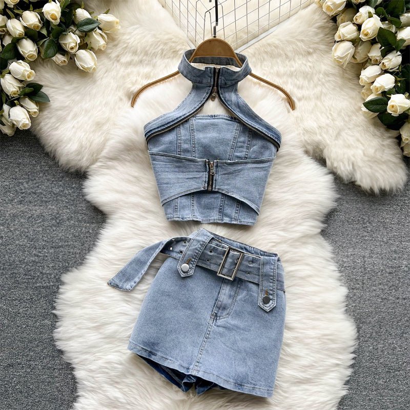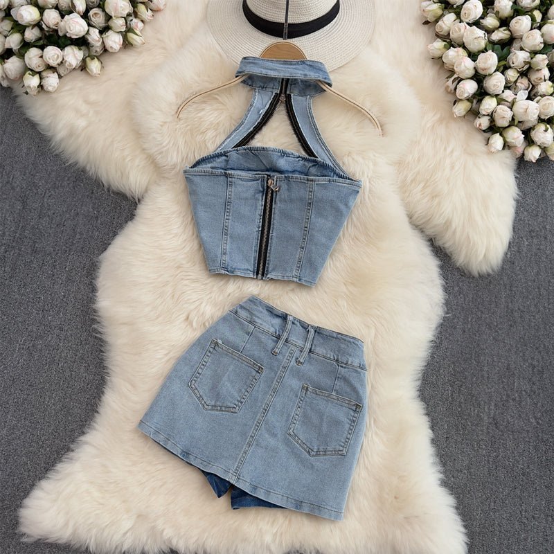 Amelie Fleur Myrna 2 Piece Set offers a timeless denim ensemble with a retro flair. Available in classic blue and sleek black variants, this set includes a mini skirt and a sleeveless top adorned with a chic collar, making it a versatile addition to your wardrobe.