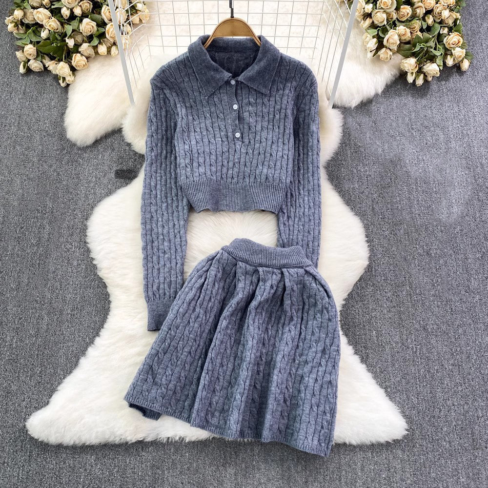 - Set Features: Polo Collar Sweater and Matching Skirt