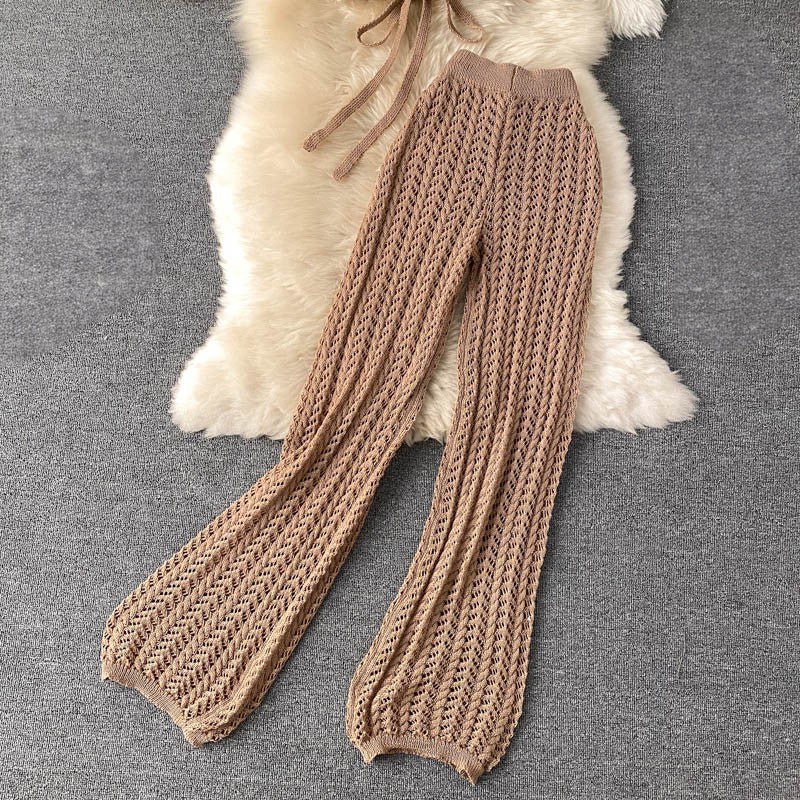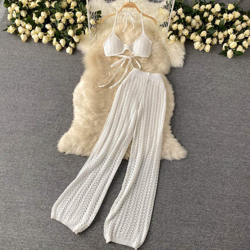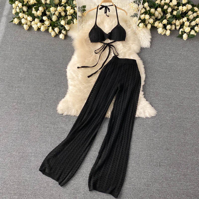 This set includes high-waisted wide-leg pants and a matching bikini top, both featuring a stylish knitted design. Perfect for sunny days and beach outings, this set effortlessly combines comfort and style for a relaxed summer look.