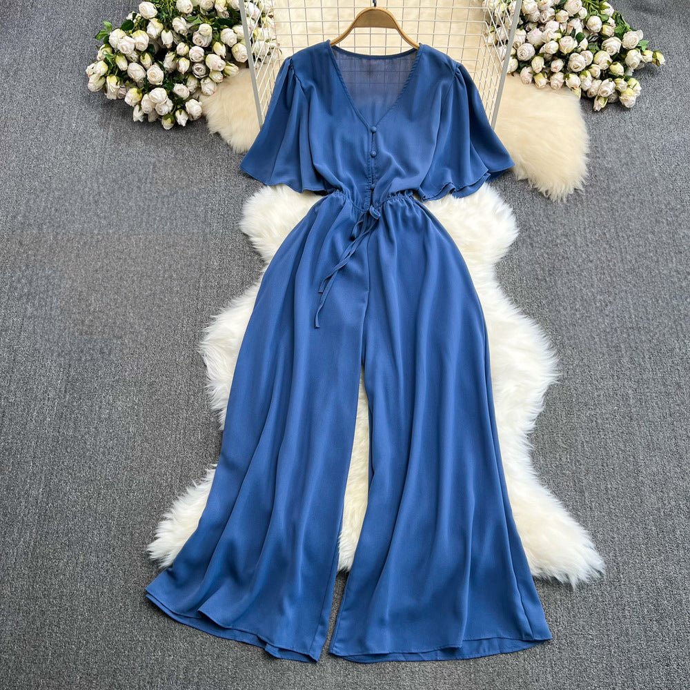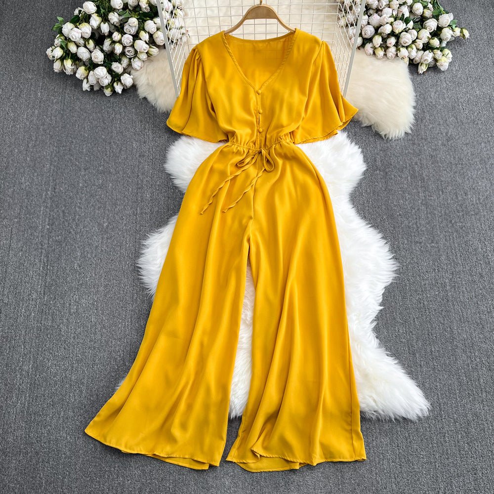 This short-sleeve jumpsuit features a flattering V-neckline and a relaxed fit, perfect for effortless summer style. Crafted from lightweight material and available in vivid colors like red, blue, and yellow, it ensures comfort and breathability on sunny days. Complete with a drawstring waistline, it offers a customizable fit for all-day wear.