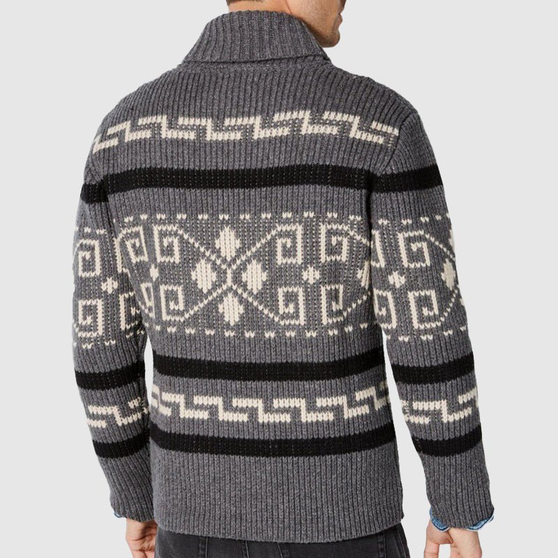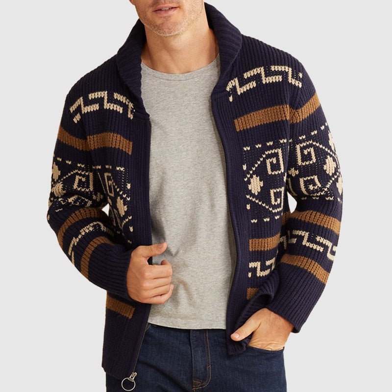Introducing the Ben Smith Jacquard Cardigan – a fusion of artistry and warmth. Crafted with meticulous detail, this cardigan showcases a mesmerizing jacquard pattern, adding a touch of sophistication to your wardrobe.