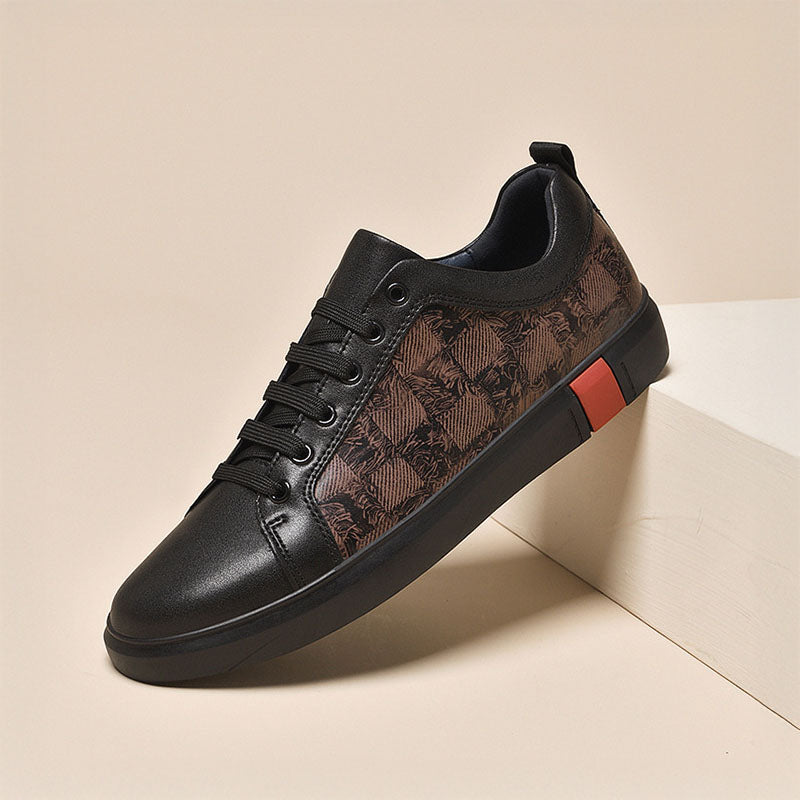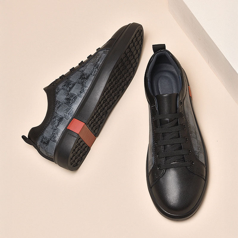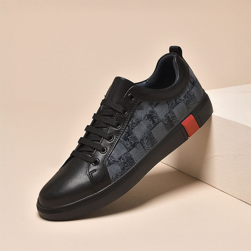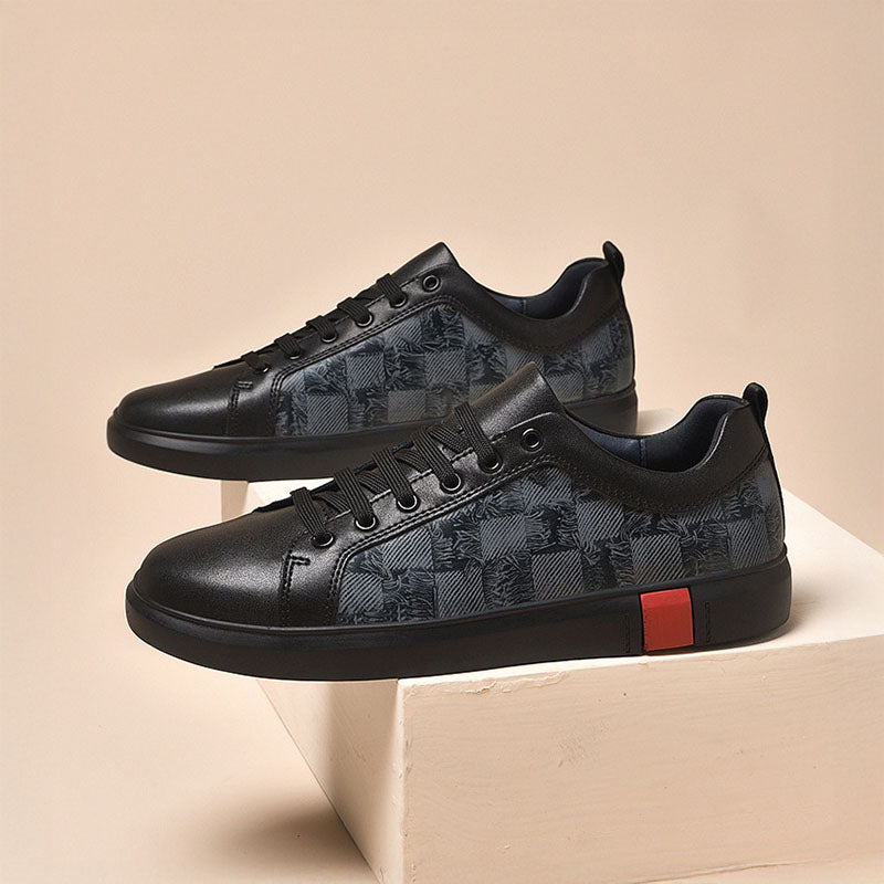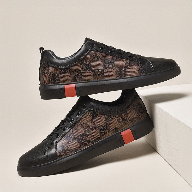 Designed for those who move with confidence, these sneakers offer a cushioned fit and durable construction. The sleek black upper combines smooth leather-like panels with a textured woven checkered pattern, creating a dynamic contrast that commands attention. Subtle yet impactful, the deep black rubber sole is punctuated by a distinctive brick-red accent, adding a refined touch of contrast.