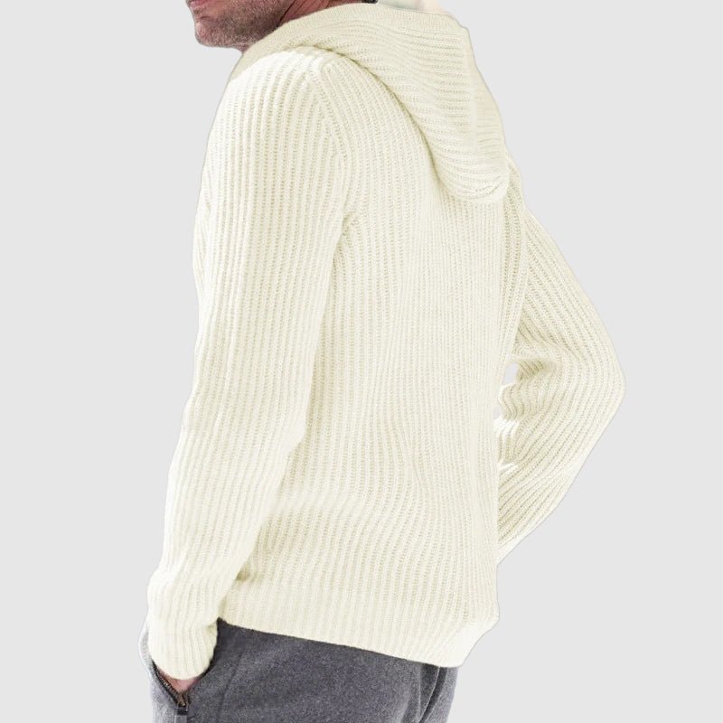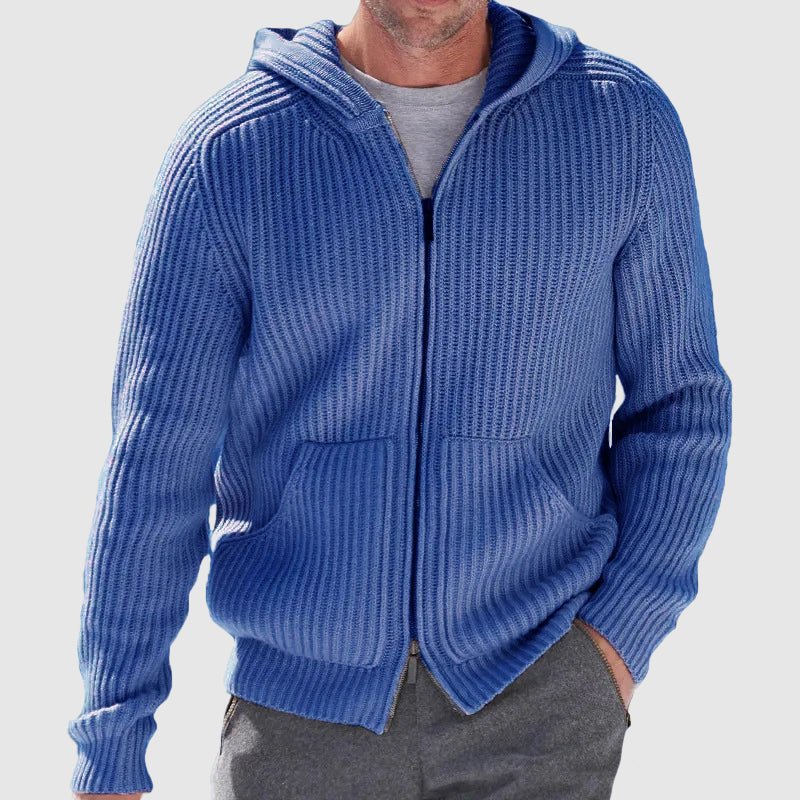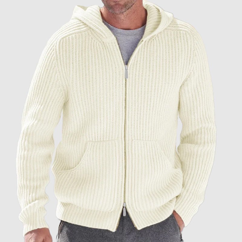 The Ben Smith Polished Knit Cardigan seamlessly blends comfort and contemporary design, featuring a practical zipper closure and a casual hood for a modern edge.