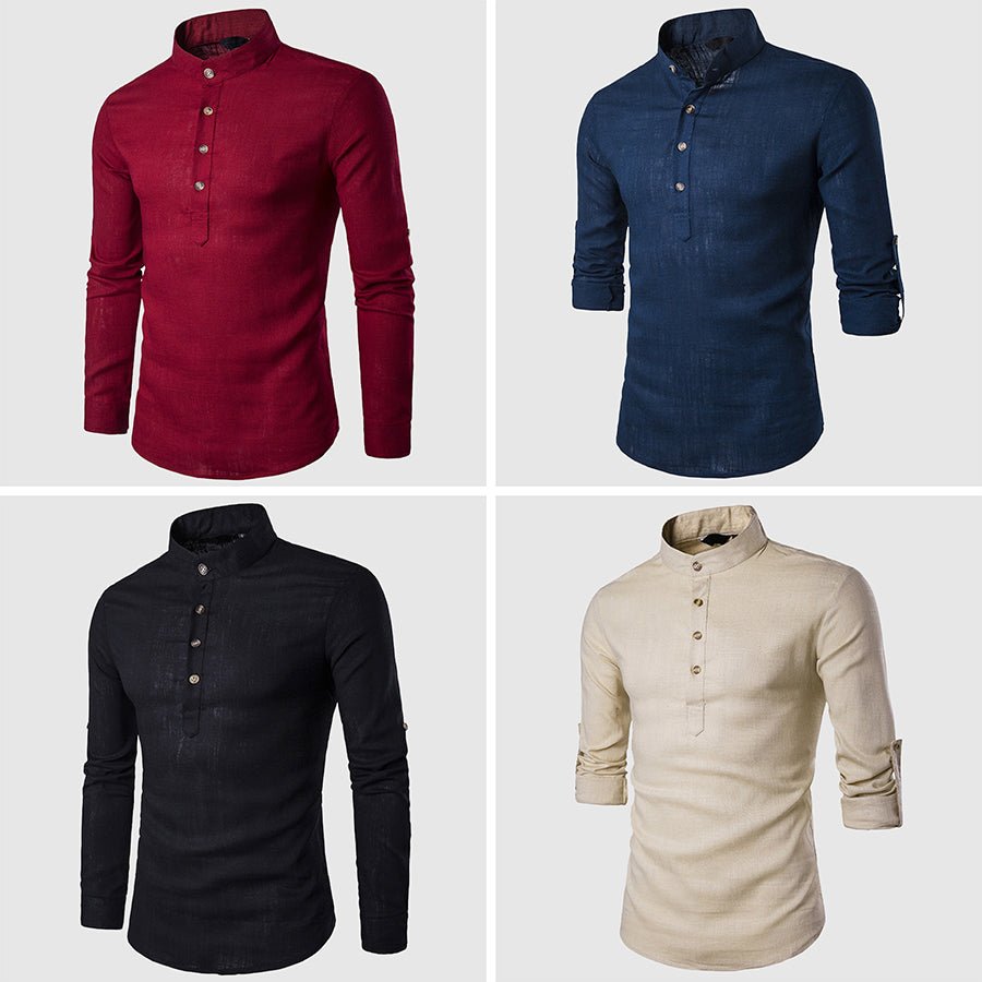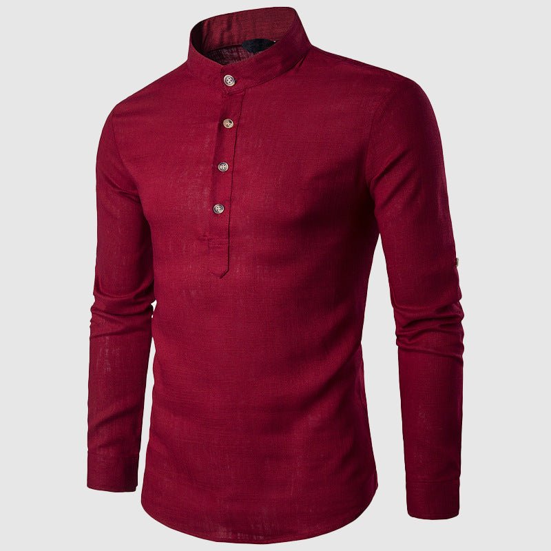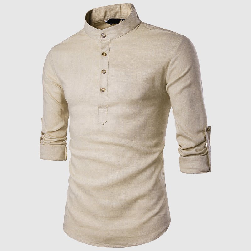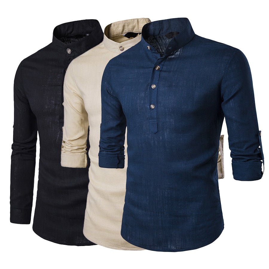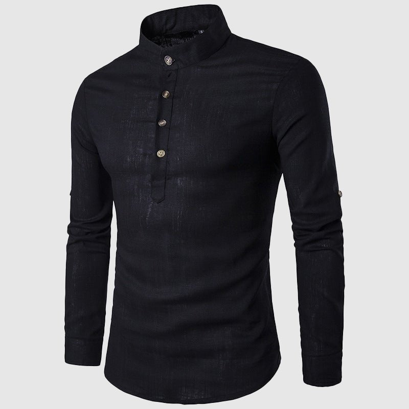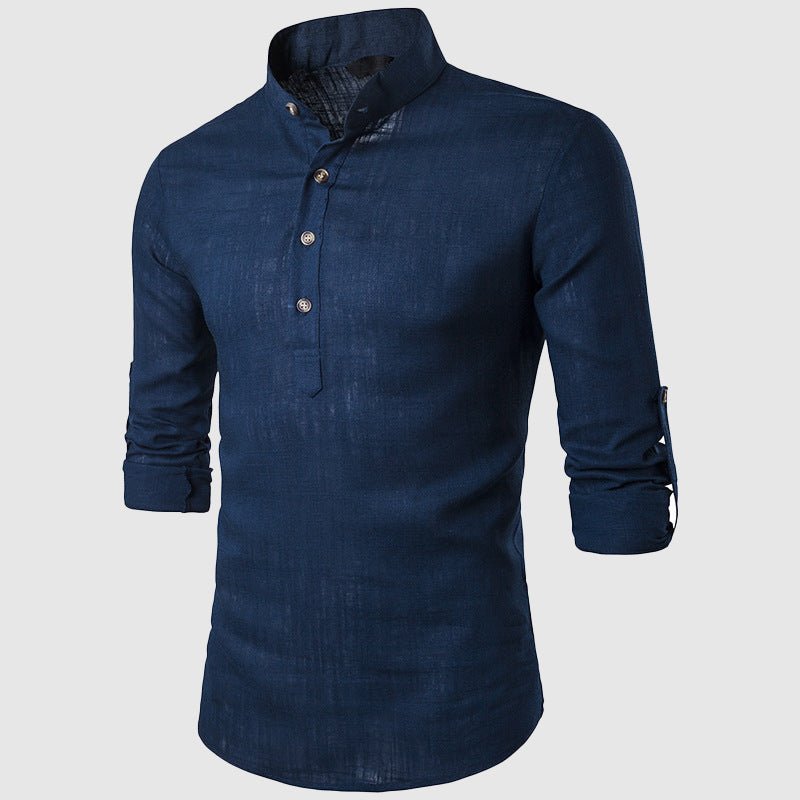 Immerse yourself in the refined texture and exceptional drape of the linen-cotton fabric, ensuring both comfort and style in every wear. The distinguished high collar sets the Ben Smith Rustic Charm Shirt apart, adding a touch of sophistication to your ensemble.