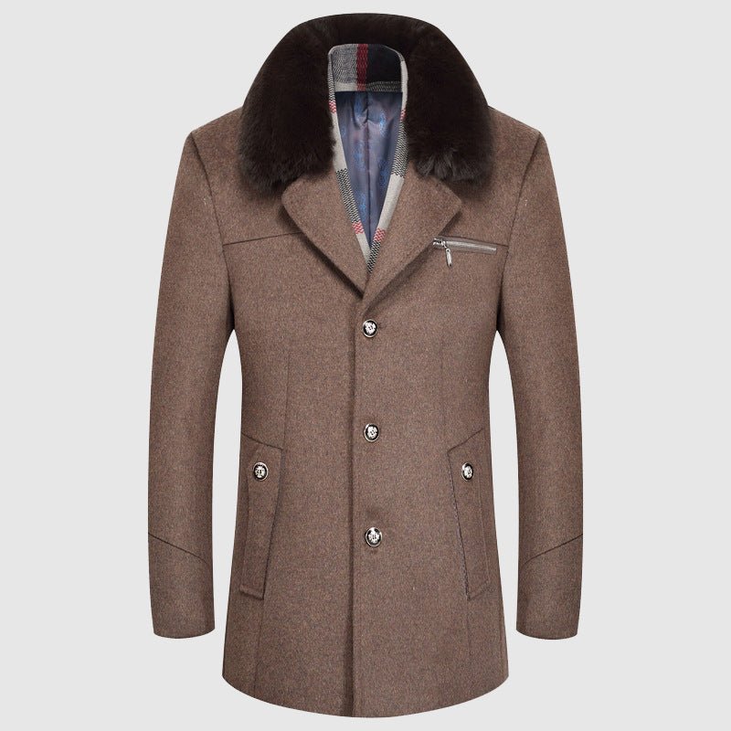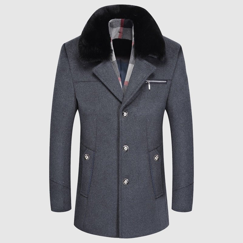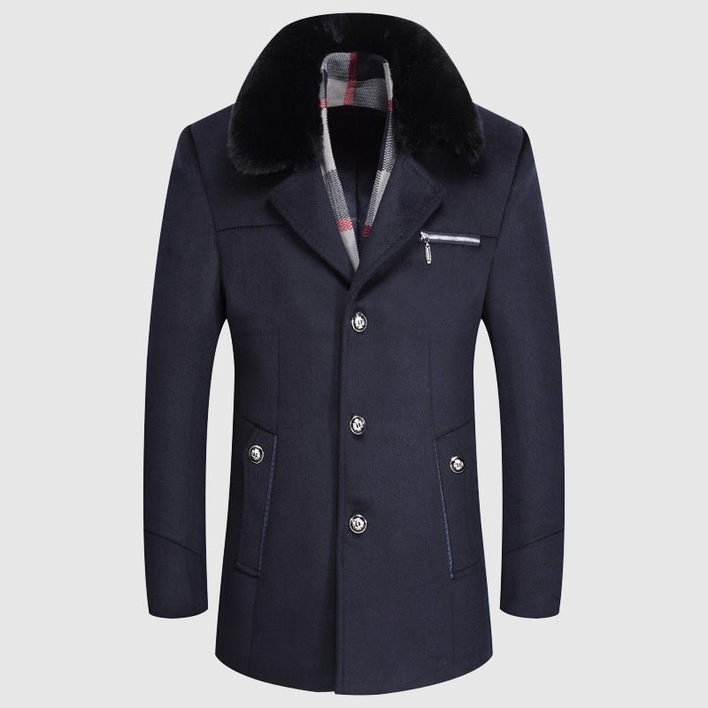 The Franco Bianchi Opulence Wool Coat is a luxurious outerwear piece that seamlessly combines warmth, comfort, and sophistication. The standout feature of this jacket is its plush faux fur collar, adding a touch of opulence to the classic wool design.