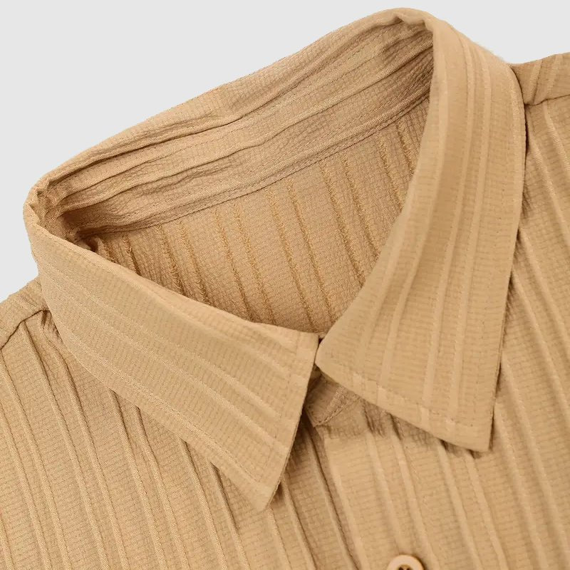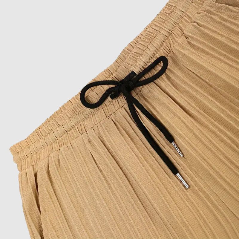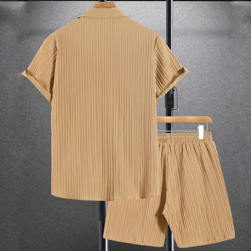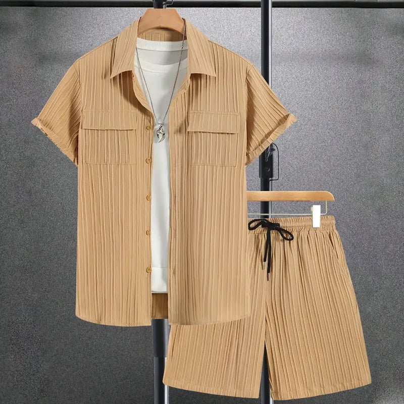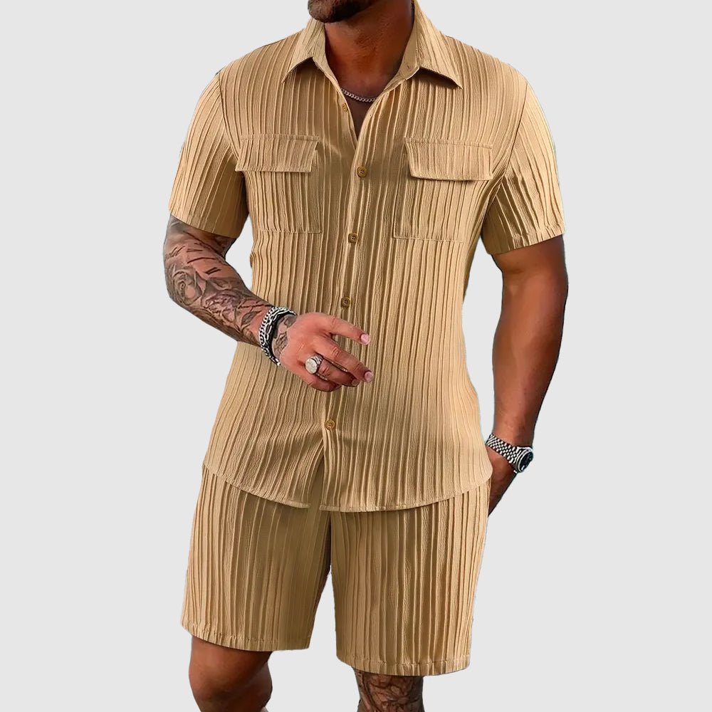 The Franco Bianchi Seaside Lounge Duo Set captures the essence of a sun-drenched vacation with its crisp, nautical stripes and relaxed silhouette. The pleated shirt adds a touch of sophistication, while the drawstring shorts ensure ultimate comfort.