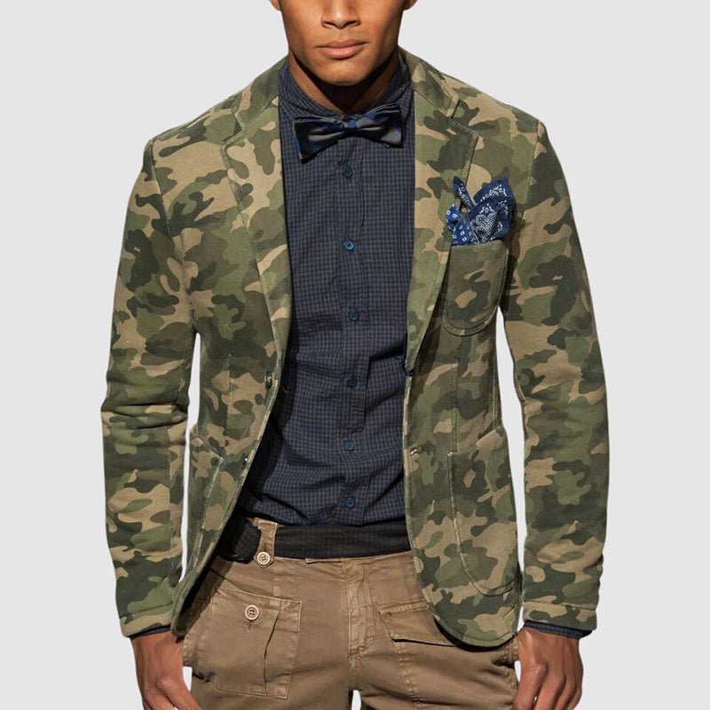 Elevate your style with the Jack Washington Camo Blazer, featuring a trendy camouflage print and multiple pockets for added convenience. This single-breasted blazer is a versatile piece that can be dressed up or down for any occasion.