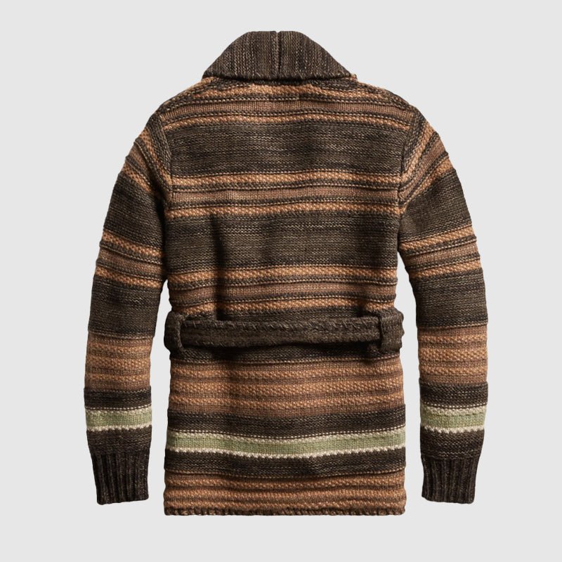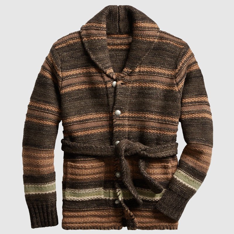 Introducing the Jack Washington Vintage Belted Cardigan in a rich brown hue, adorned with a classic stripes pattern. This cardigan effortlessly marries retro charm with contemporary style. Its belted design not only adds a touch of sophistication but also ensures a tailored fit.