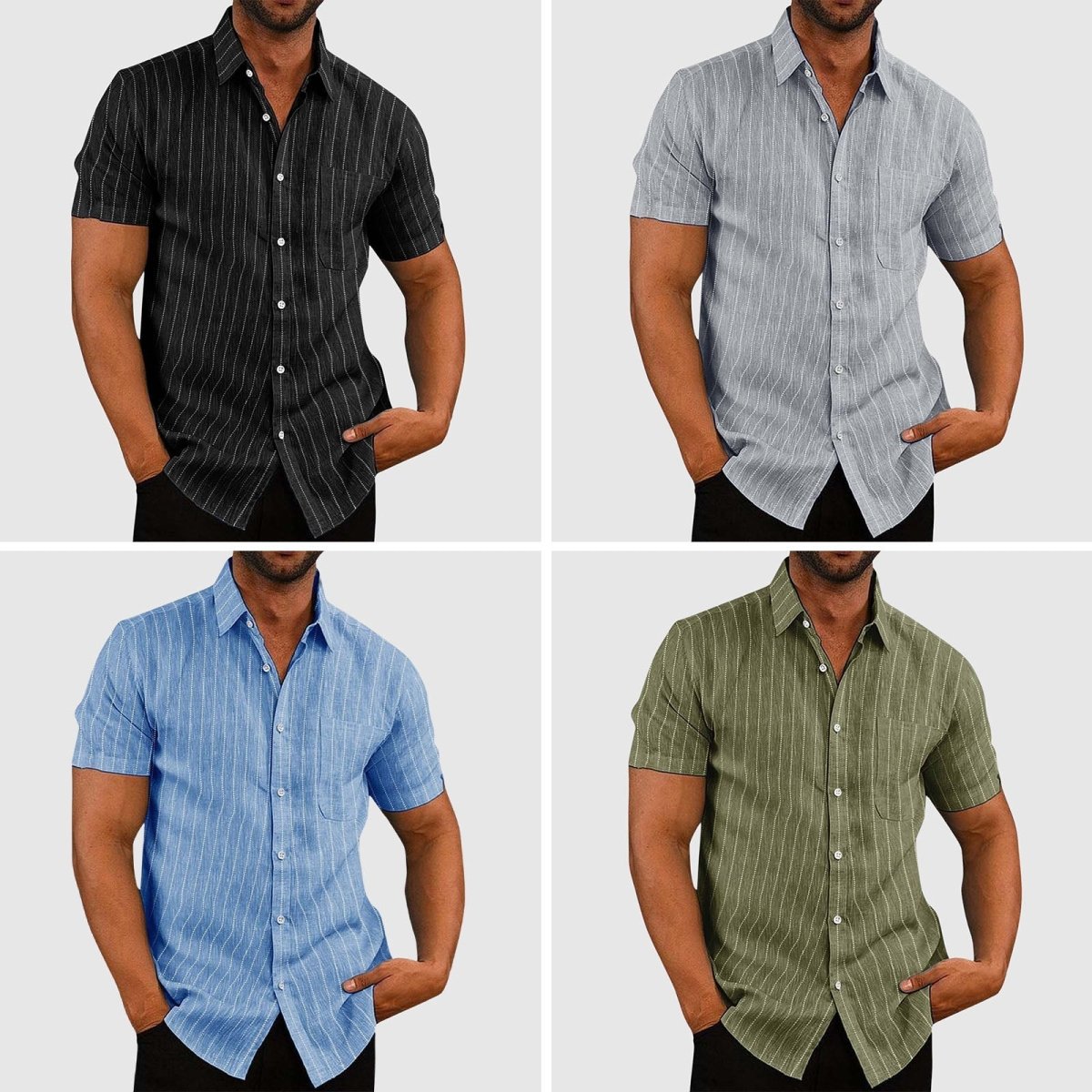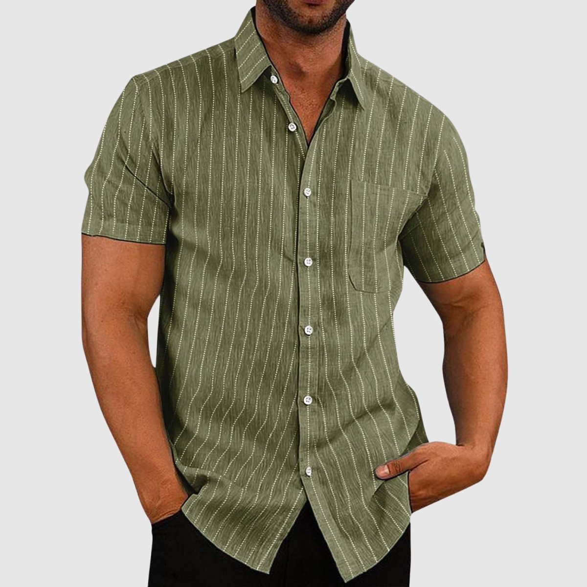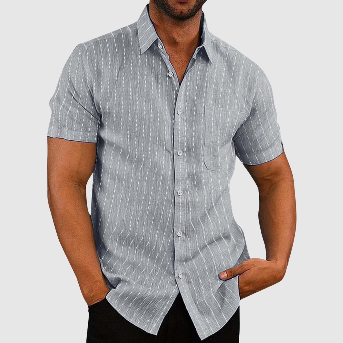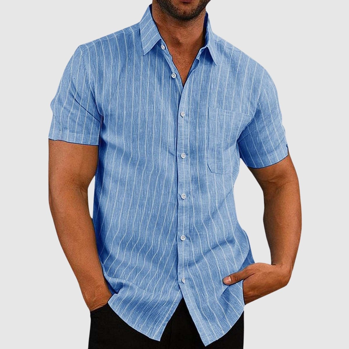 Designed for both comfort and flair, the short sleeves and classic turn-down collar of the James Scott Casual Striped Shirt offer a polished yet relaxed aesthetic. With a stylish striped pattern and a practical chest pocket, this shirt effortlessly blends versatility and personality for any casual occasion.