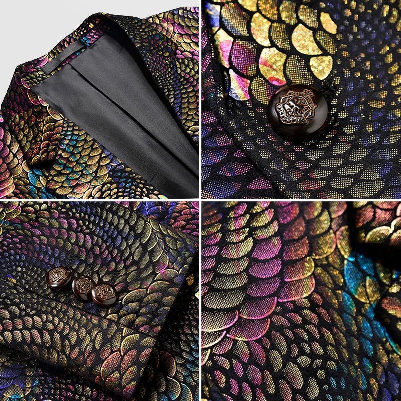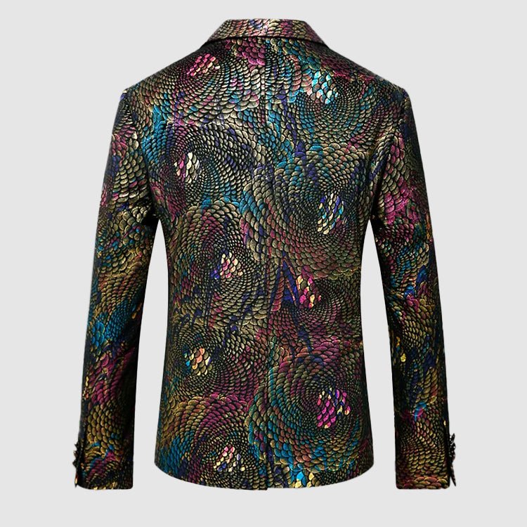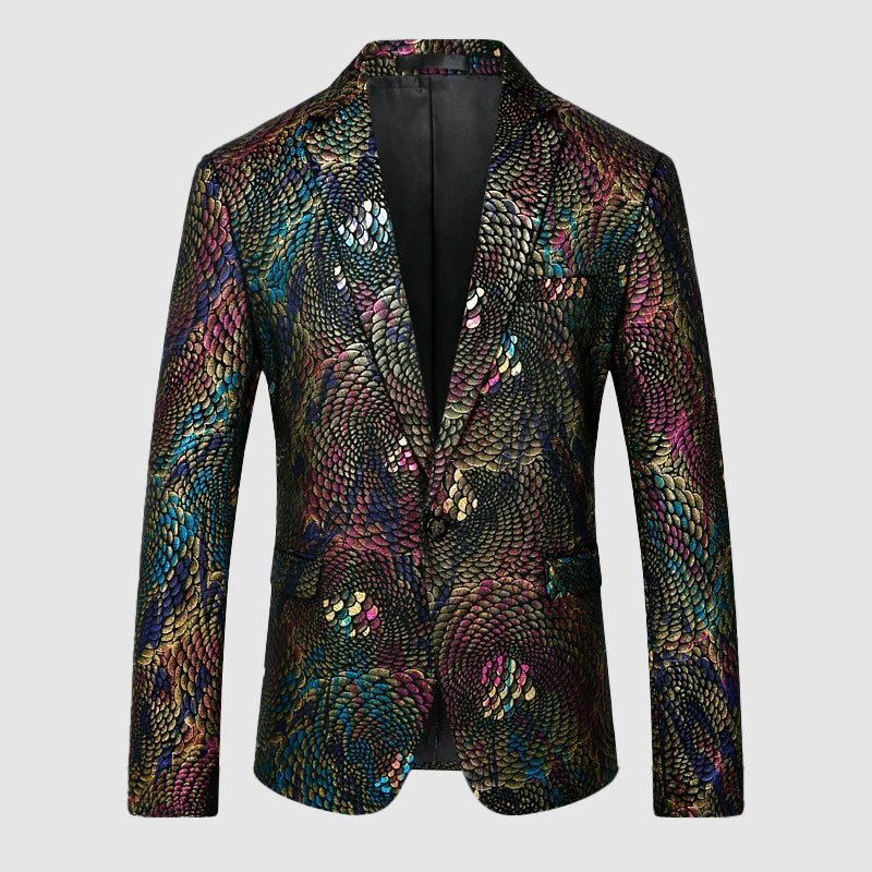 James Scott Gala Glimmer Blazer is an enigmatic fashion statement, boasting a mesmerizingly colorful iridescent pattern. With its tailored fit and vibrant tones, this blazer is a bold testament to individuality and style, destined to turn heads wherever it goes.
