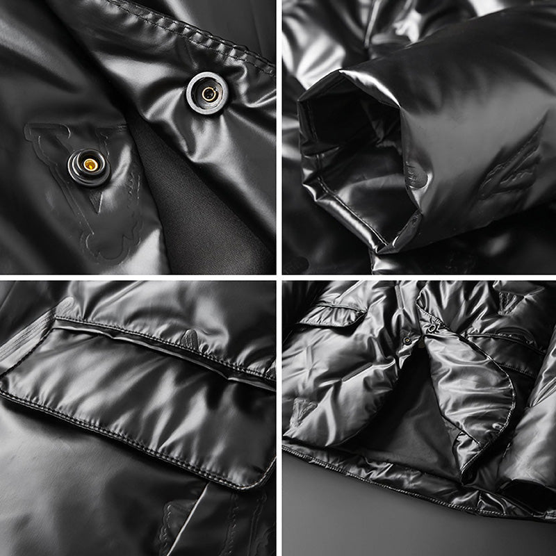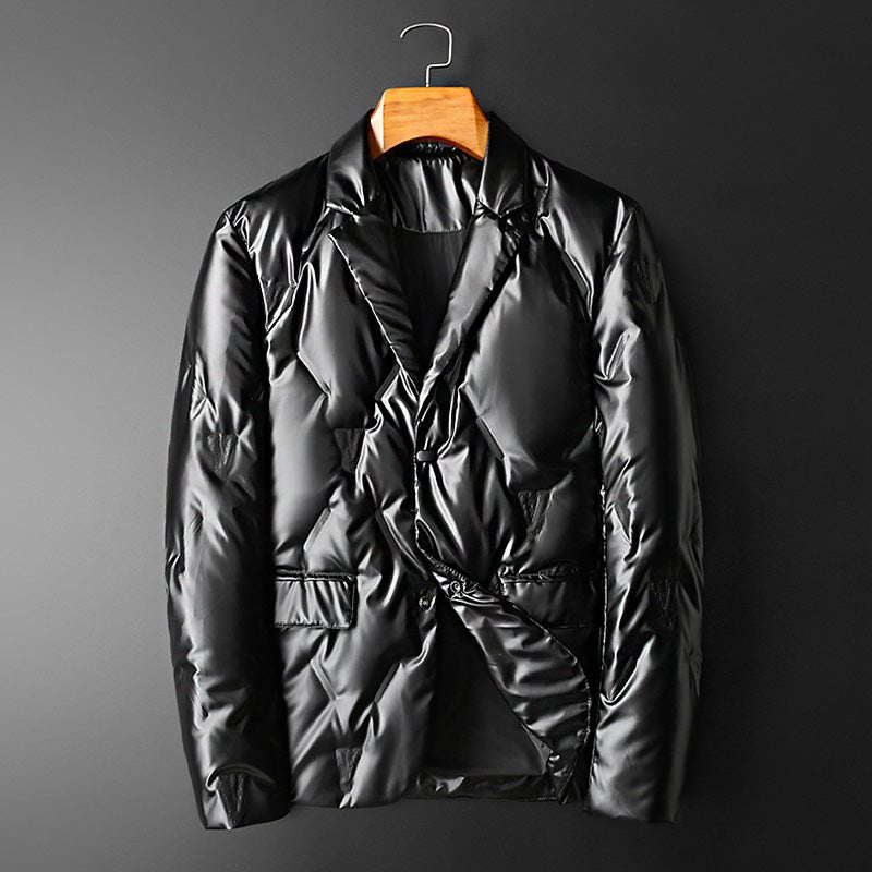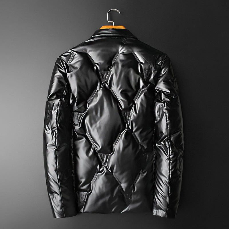 The James Scott Radiant Rave Jacket, with its unique structural diamond-shaped pattern and a subtle glossy finish, is designed to elevate your style to a whole new level. It catches the light just right, creating a subtle sheen that sets you apart in any crowd.
