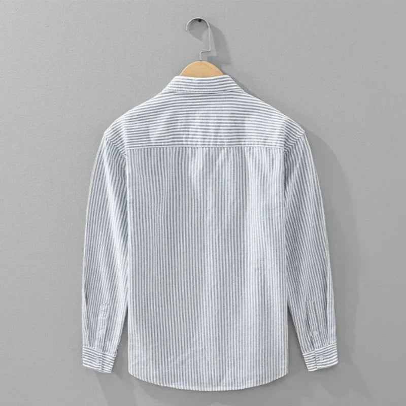 Crafted from our signature Gossamer Linen, this striped shirt balances weightlessness with intention. It drapes clean and cool, allowing air to move freely while maintaining a refined silhouette—an everyday essential with quiet confidence.
