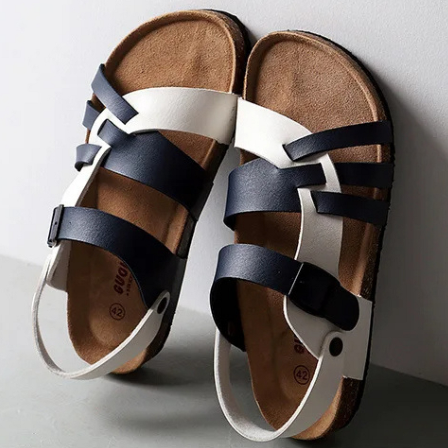 Crafted with a triple-tone vegan leather weave, these sandals offer a refined look with an adjustable buckle strap, a contoured cork-style footbed that molds to your stride, and a breathable open-toe design. Finished with a non-slip rubber sole, they’re built for comfort, grip, and effortless all-day wear.
