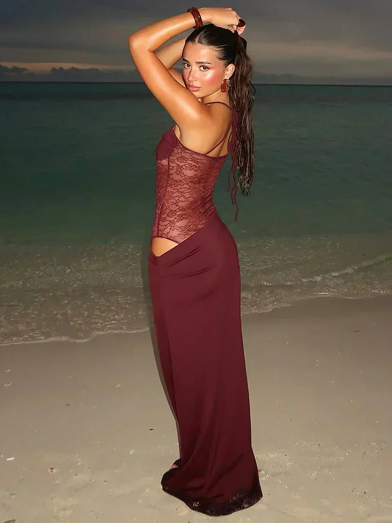 At Sophie’s Boutique, we adore dresses that blend sweetness with a little sass—and the Noemi – Cryptographic Lace Trimmed Backless Maxi Dress is a shining example. With its delicate lace corset bodice, dainty shoulder ties, and subtle waist cutouts, this gown brings timeless charm with just the right hint of drama.