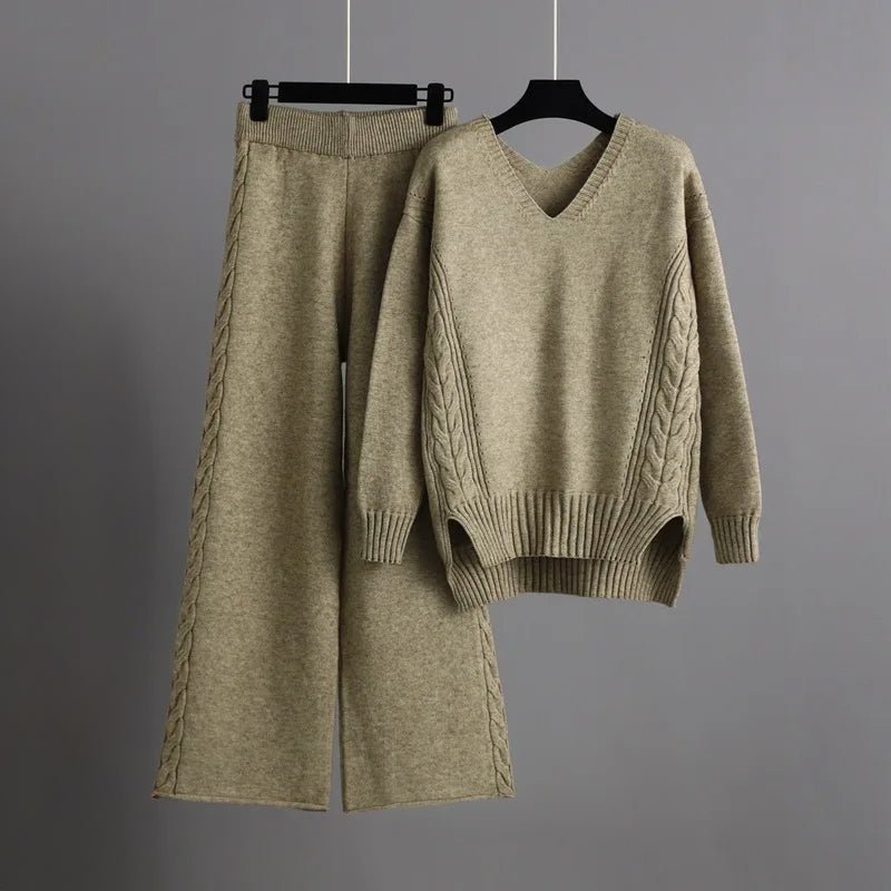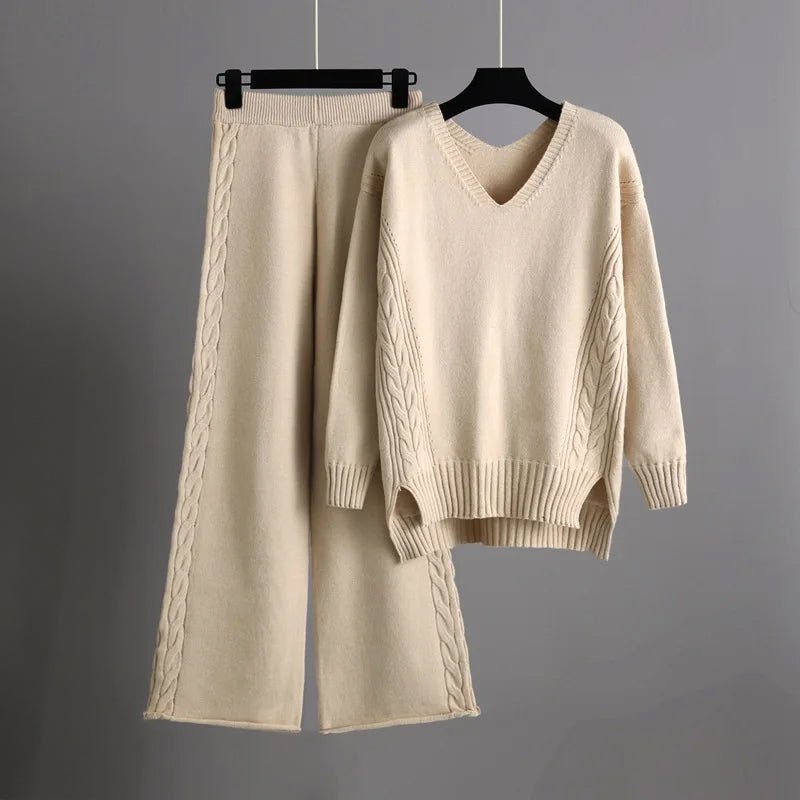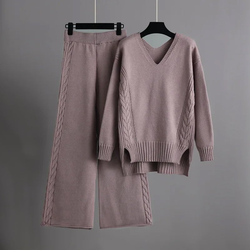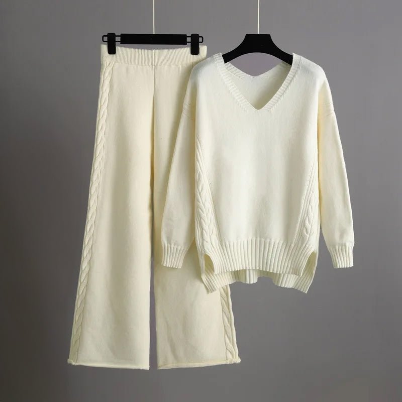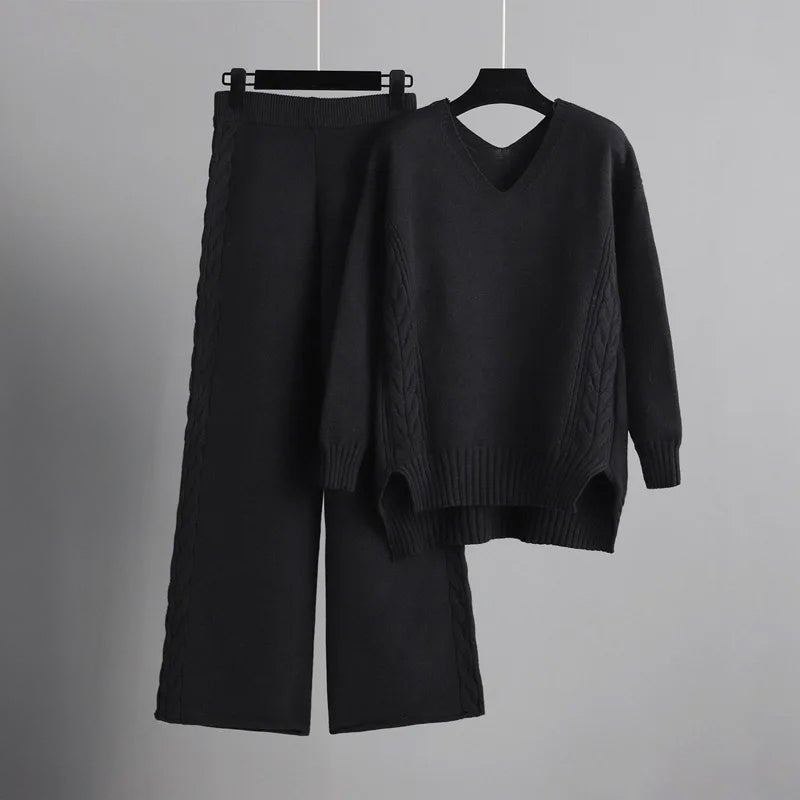 Set includes: Wide-leg full-length pants and V-neck pullover