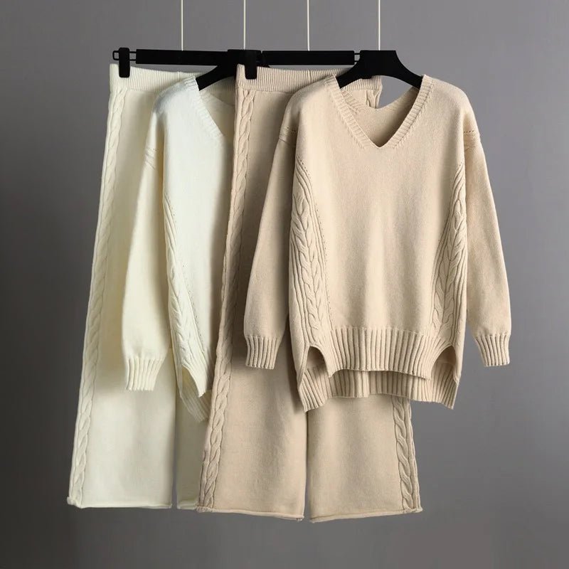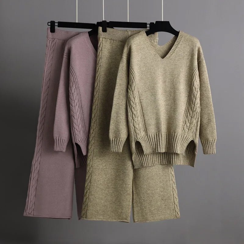 Elevate your style with the Paris Knitted 2-Piece Set, a perfect blend of comfort and sophistication. This ensemble features wide-leg pants that offer a trendy and relaxed fit, ensuring both comfort and fashion. The V-neck pullover complements the look, adding a touch of elegance to the ensemble.