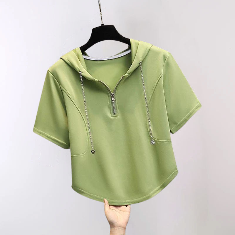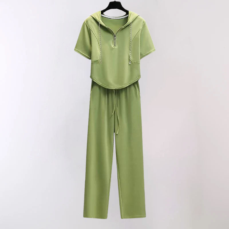 Step into effortless style with the Sofie Malou Laramie Sporty Set. This chic ensemble features relaxed-fit, wide-leg pants that offer both comfort and style, perfect for a casual yet sporty look. Paired with a short-sleeved shirt featuring a hoodie and half-zip detail, this set exudes modern athleticism with a touch of urban flair.