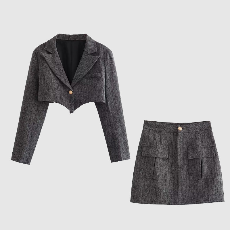 Perfect for those who aren't afraid to stand out, this set is sure to turn heads wherever you go. The cropped blazer exudes contemporary flair, while the skirt features two front pockets for added functionality.