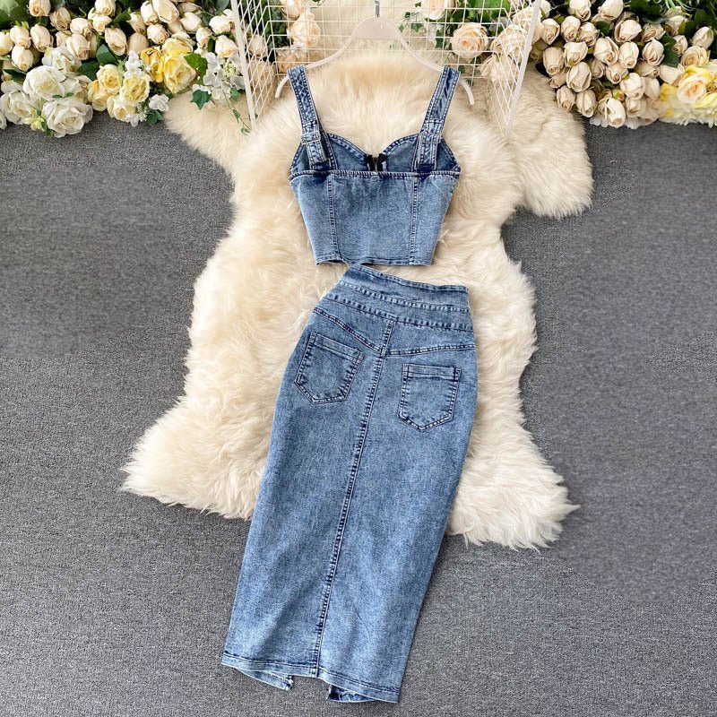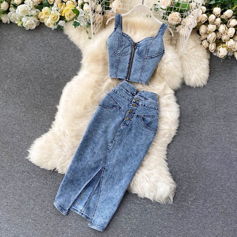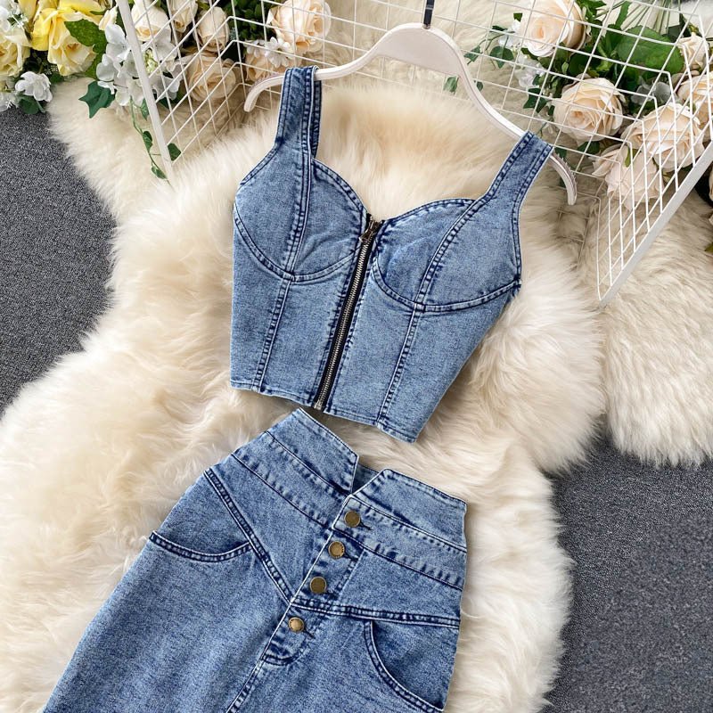 This two-piece set features a midi denim skirt paired with a sleeveless corset top, complete with a zip-up front for added edge. With its chic blue denim fabric and flattering silhouette, this set is perfect for making a bold fashion statement wherever you go.