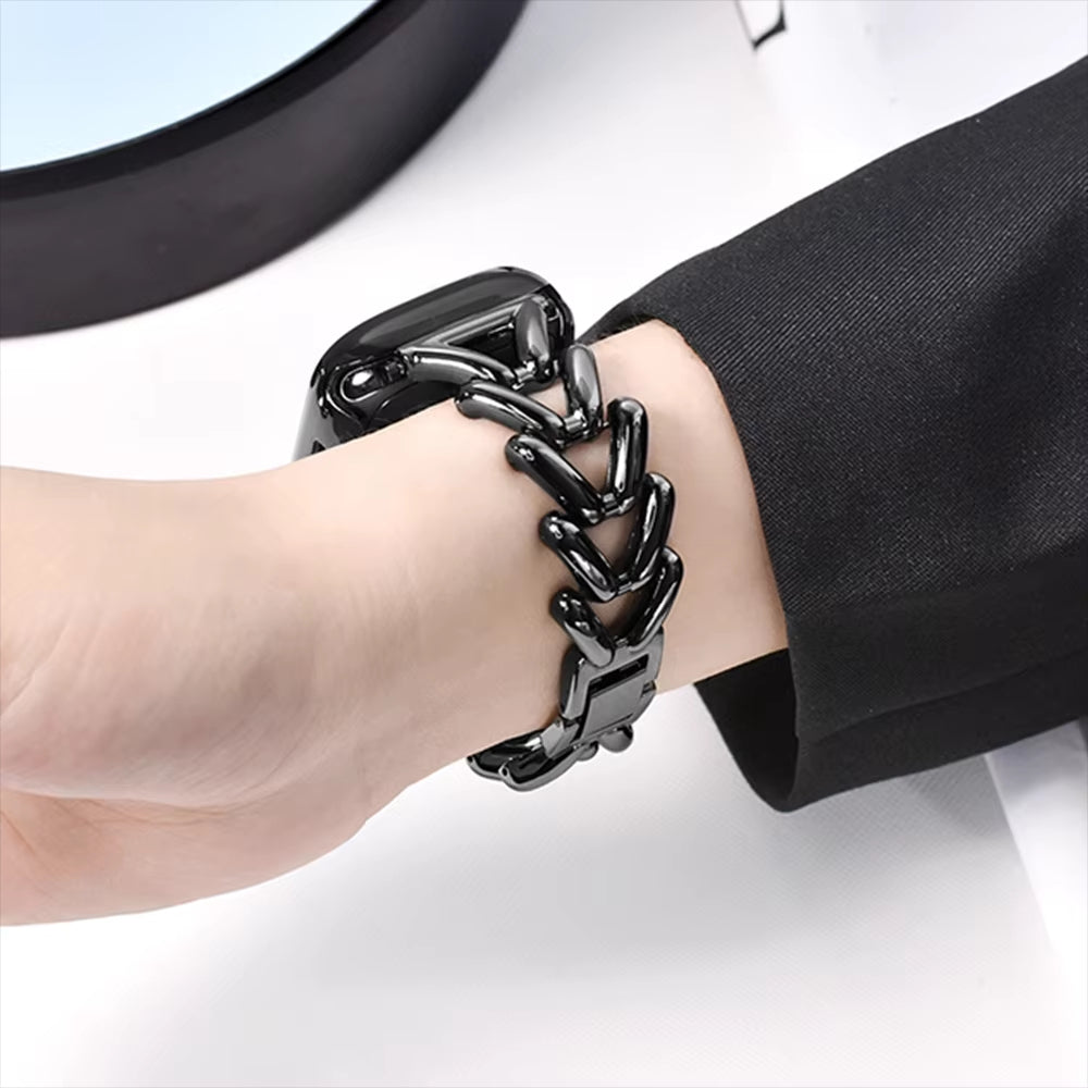Crafted from precision-engineered V-links in high-shine stainless steel, this band transforms your Apple Watch into a sculpted statement piece. The snap-in clasp ensures a secure, seamless fit, while a tarnish-resistant finish maintains its polished, designer silhouette.