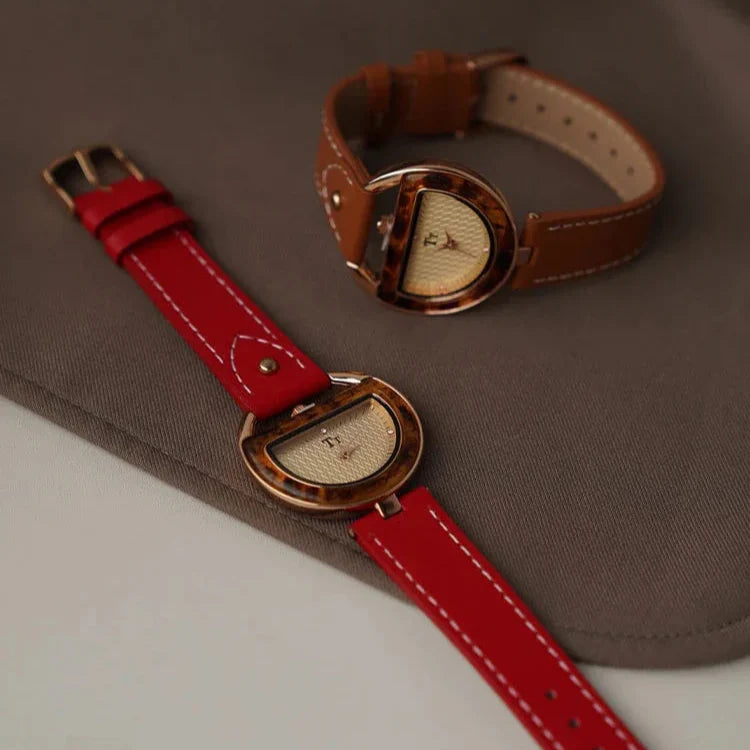 A sculptural half-moon face set in tortoiseshell and anchored by a genuine leather strap creates a look that’s anything but expected. With stainless steel durability and a custom fit, it’s ready for daily wear with lasting impact.