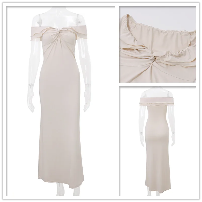 Women’s Maxi Dress – Off-Shoulder Bodycon Fit – Twisted Bust – Stretch Fabric