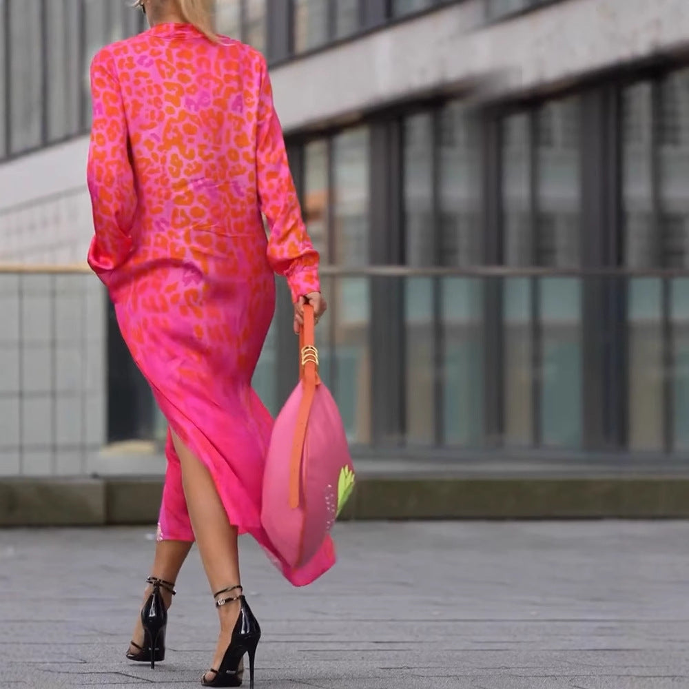 Women’s Midi Dress – Relaxed Fit – V-Neck – Long Sleeve – Animal Print – Pockets