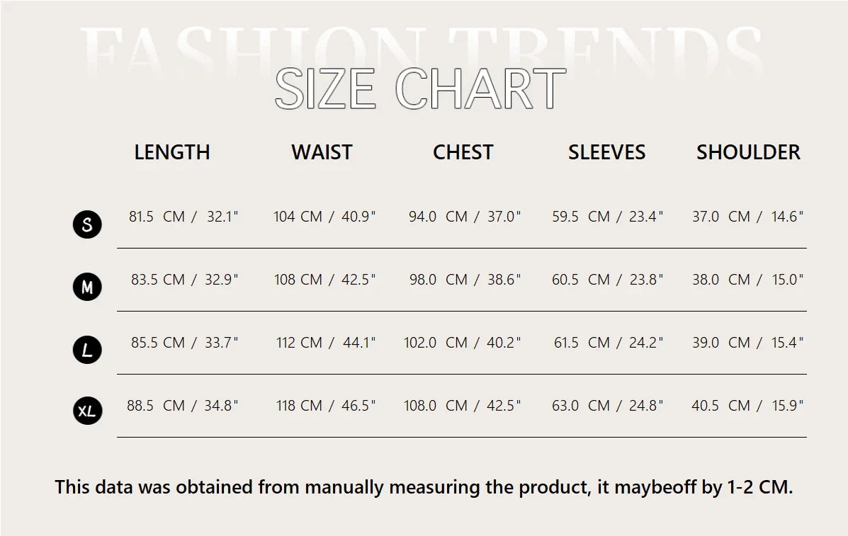 | Size | Bust (in) | Waist (in) | Hips (in) |