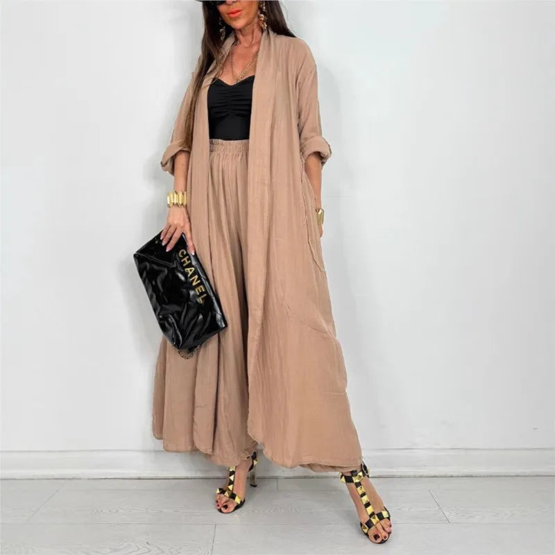 The cardigan drapes gracefully over the body, adding a touch of elegance to your look, while the high-waisted pants offer a flattering silhouette with all-day comfort. Whether you're working from home, heading to brunch, or enjoying a cozy evening out, Abigail™ brings understated luxury to every moment.