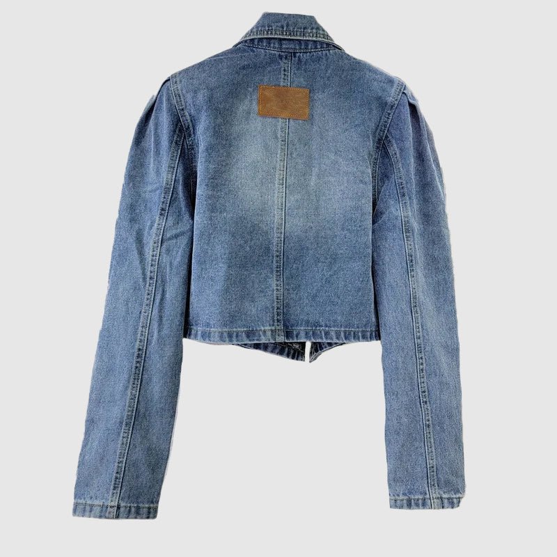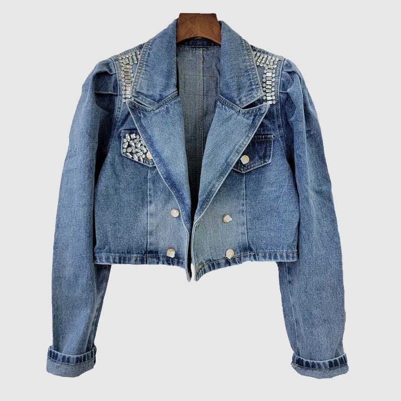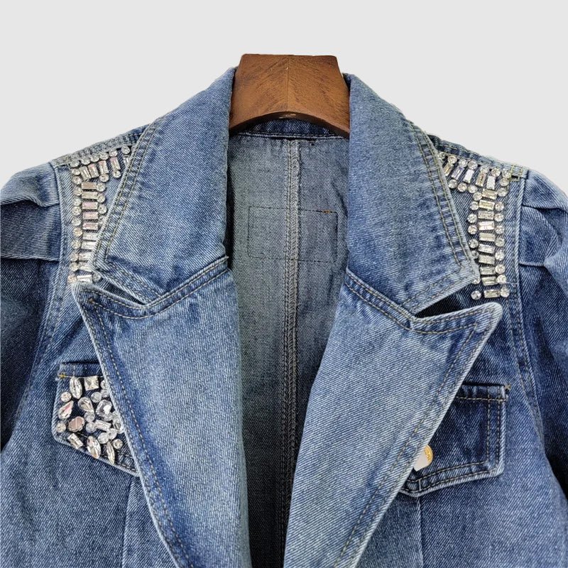 Embrace the vibrant spirit of spring with the Adeline Cityscape Denim Jacket, a dazzling dance between classic cool and playful luxury. Delicate clusters of sparkling rhinestones dance across the garment, catching the light with a playful glint.