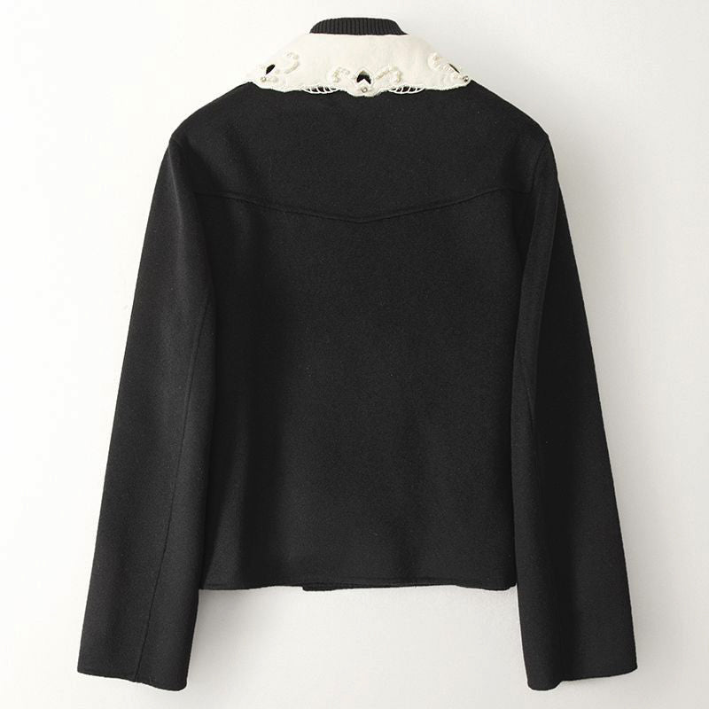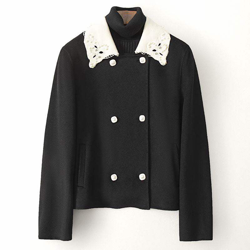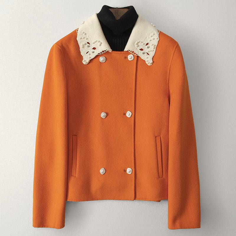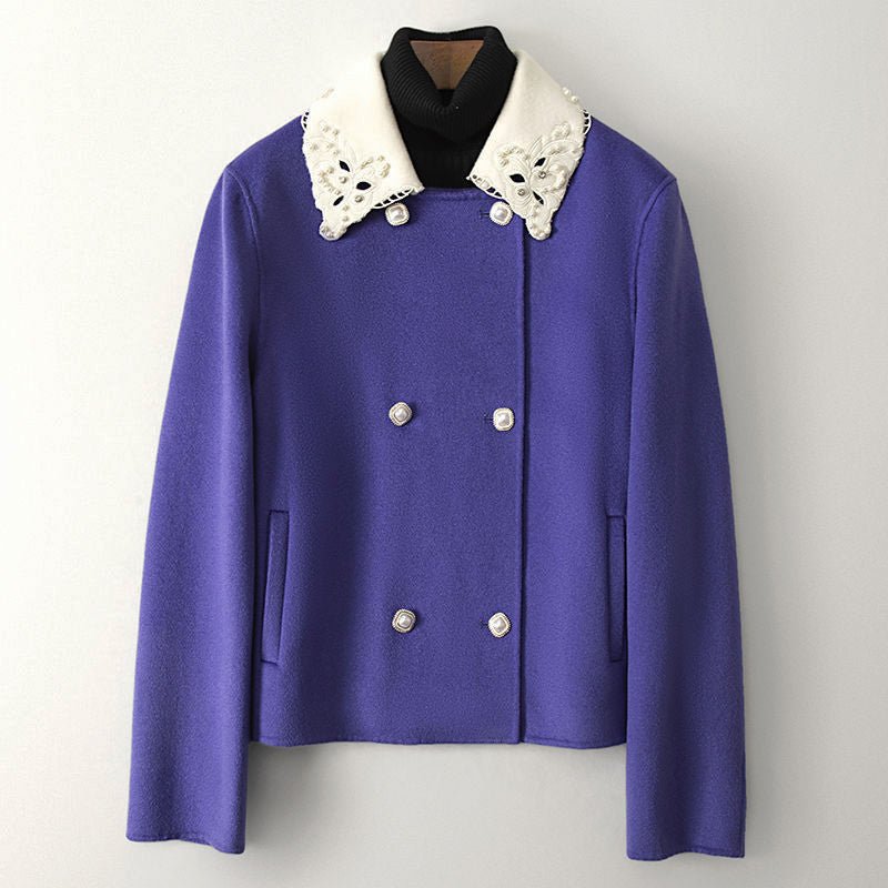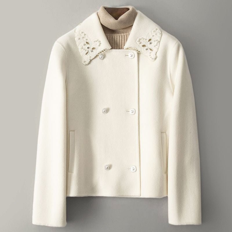 Elevate your winter style with the Adeline Woolen Jacket, a perfect blend of sophistication and warmth. This jacket features a luxurious woolen texture that exudes elegance, making it an ideal choice for cold weather. The standout feature of this jacket is its decorative lace collar, adding a touch of femininity and charm to your ensemble.