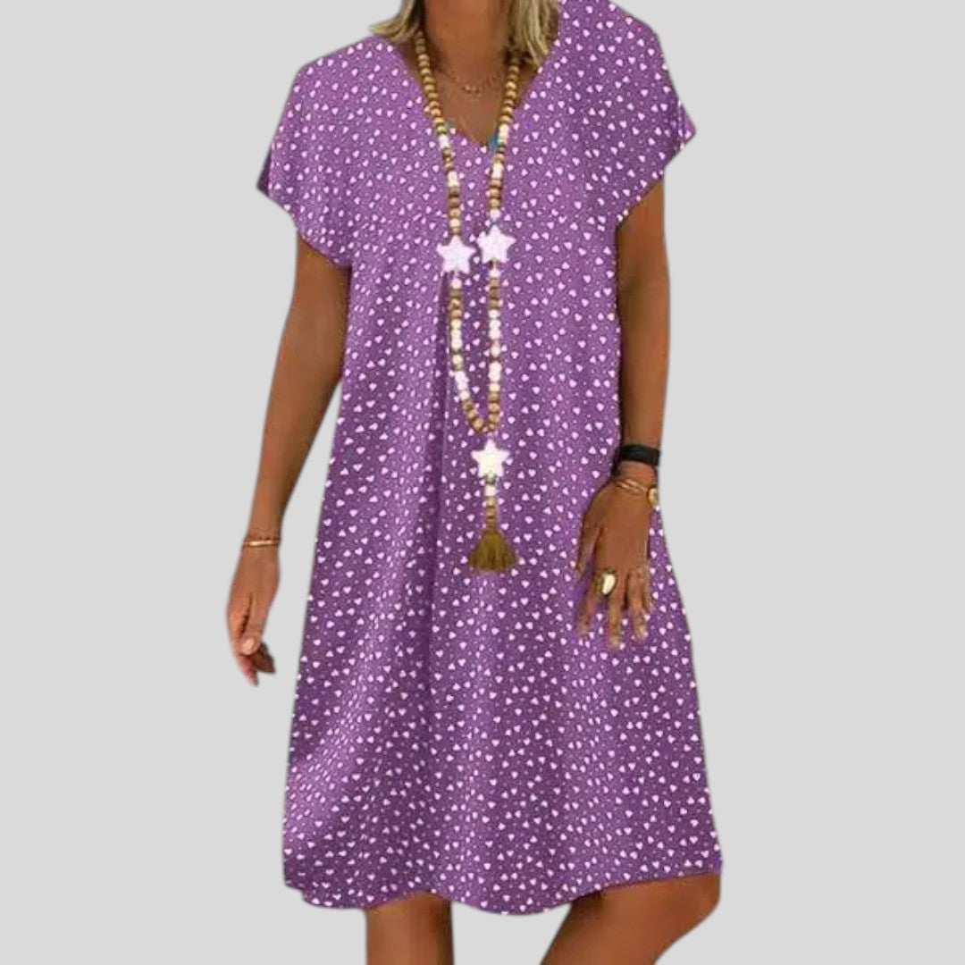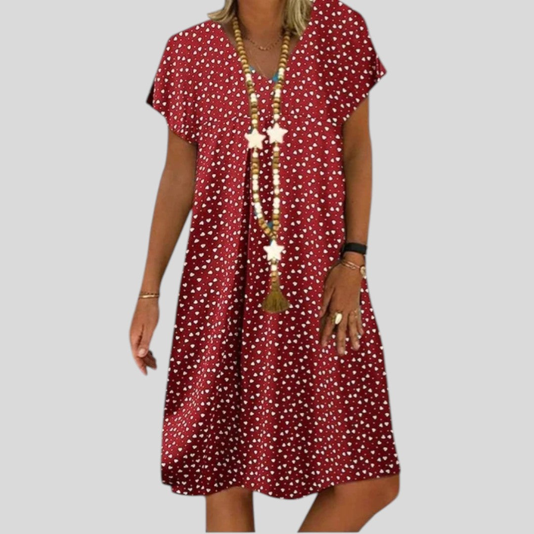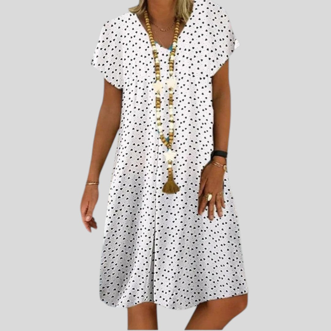This charming summer dress features a delicate heart print and a flattering cut that’s perfect for warm, sunny days. Light, fun, and feminine — it’s designed to make you feel lovely from morning to evening.