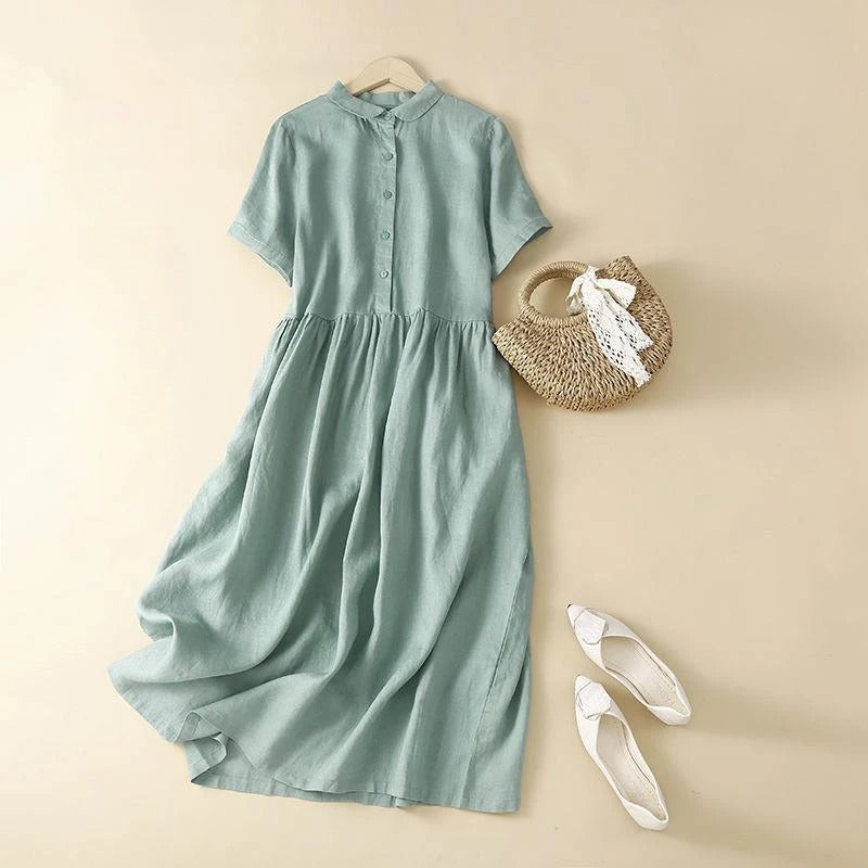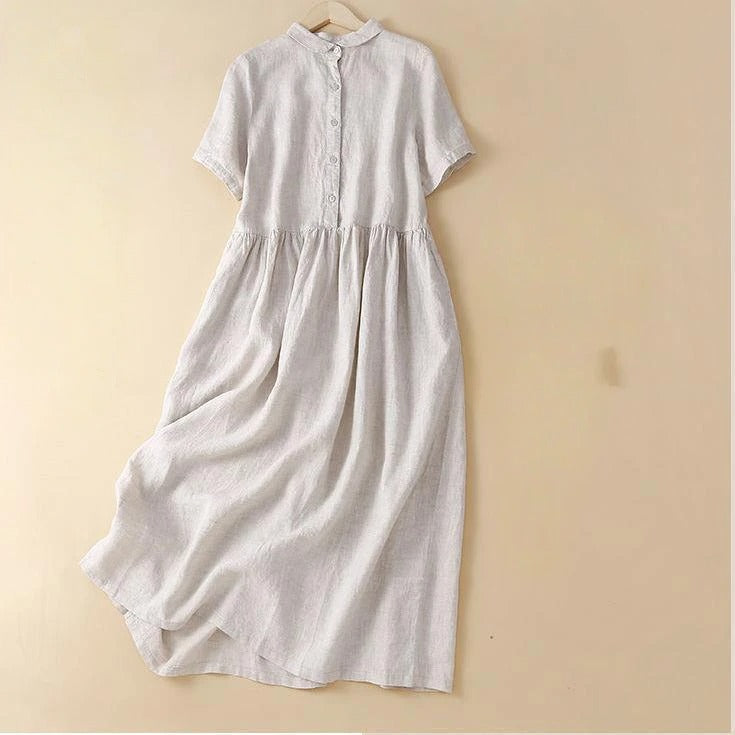 Crafted from our signature Gossamer Linen, this dress is light as a whisper and made to move with you. A softly gathered skirt and a minimal mandarin collar offer just the right balance of ease and refinement—perfect for golden hour strolls or quiet weekend escapes.