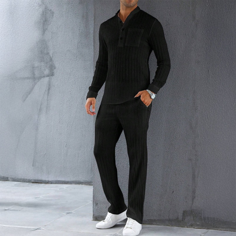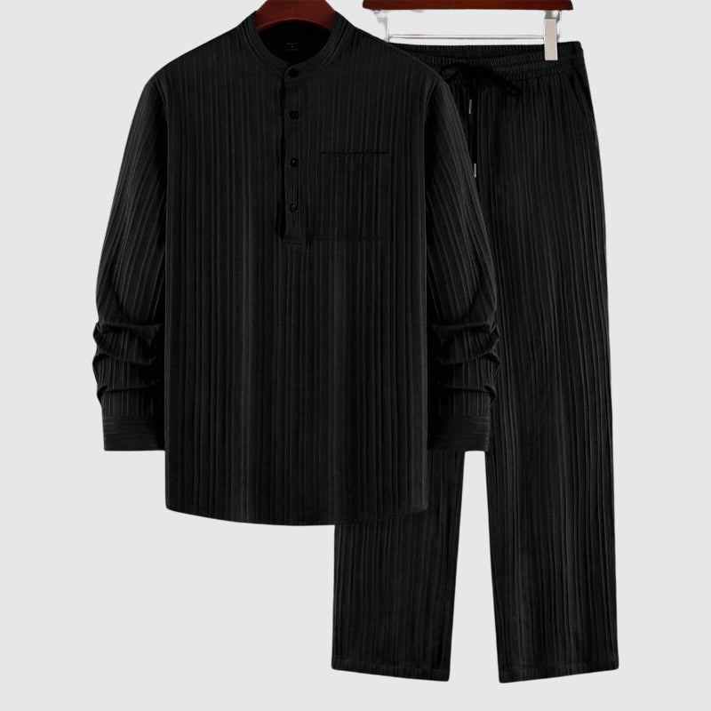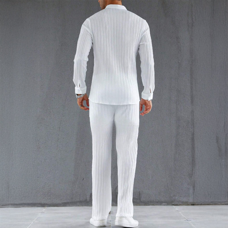 Featuring a finely textured, vertical-striped design, this lightweight ensemble offers refined comfort from sunrise strolls to sunset aperitifs. The relaxed long-sleeve shirt with a minimal mandarin collar is paired with tailored drawstring trousers, creating a clean and elevated silhouette that breathes summer.