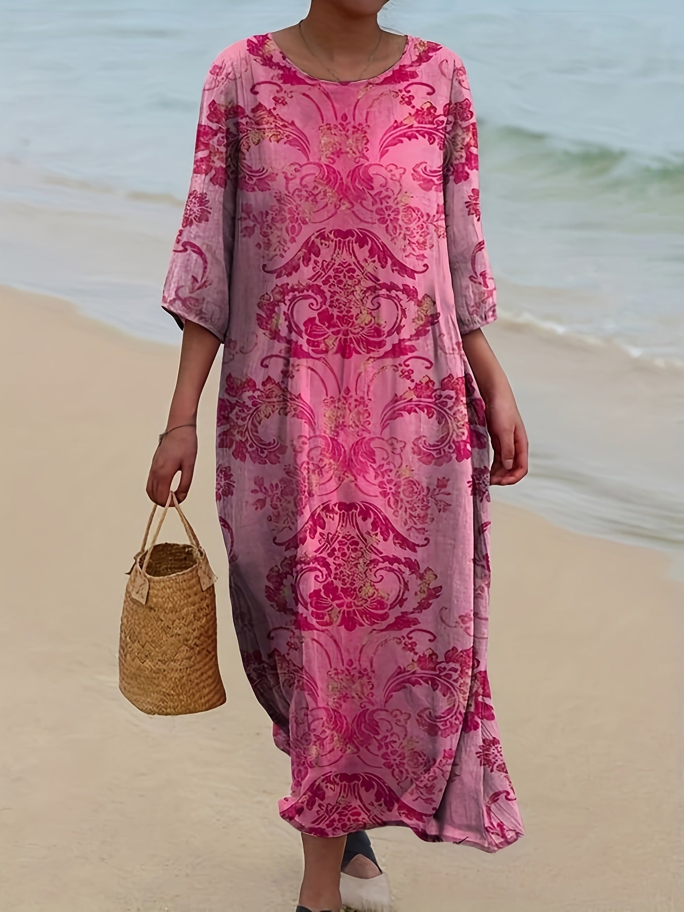 Infused with intricate patterns and rich shades of pink, this dress is your ticket to effortless boho glamour. The flowing design offers relaxed comfort, while the detailed print adds a luxe, artistic touch for your sun-drenched adventures.