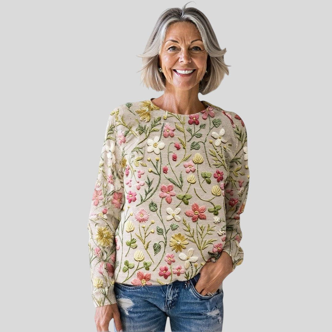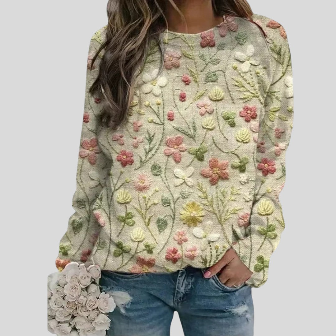 The Amelia Floral Women’s Sweater pairs soft knit fabric with delicate floral details. Perfect for cooler days, it offers warmth without bulk, keeping you comfortable and stylish.