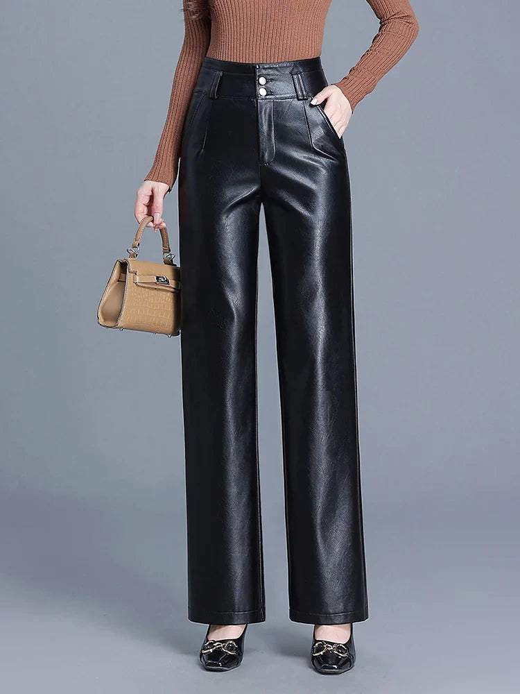 These pants bring a modern edge to your wardrobe with a high-waisted, wide-leg silhouette and a sleek leather finish. Perfectly combining elegance and attitude, these trousers are designed to make a statement wherever you go, from the office to a night out.