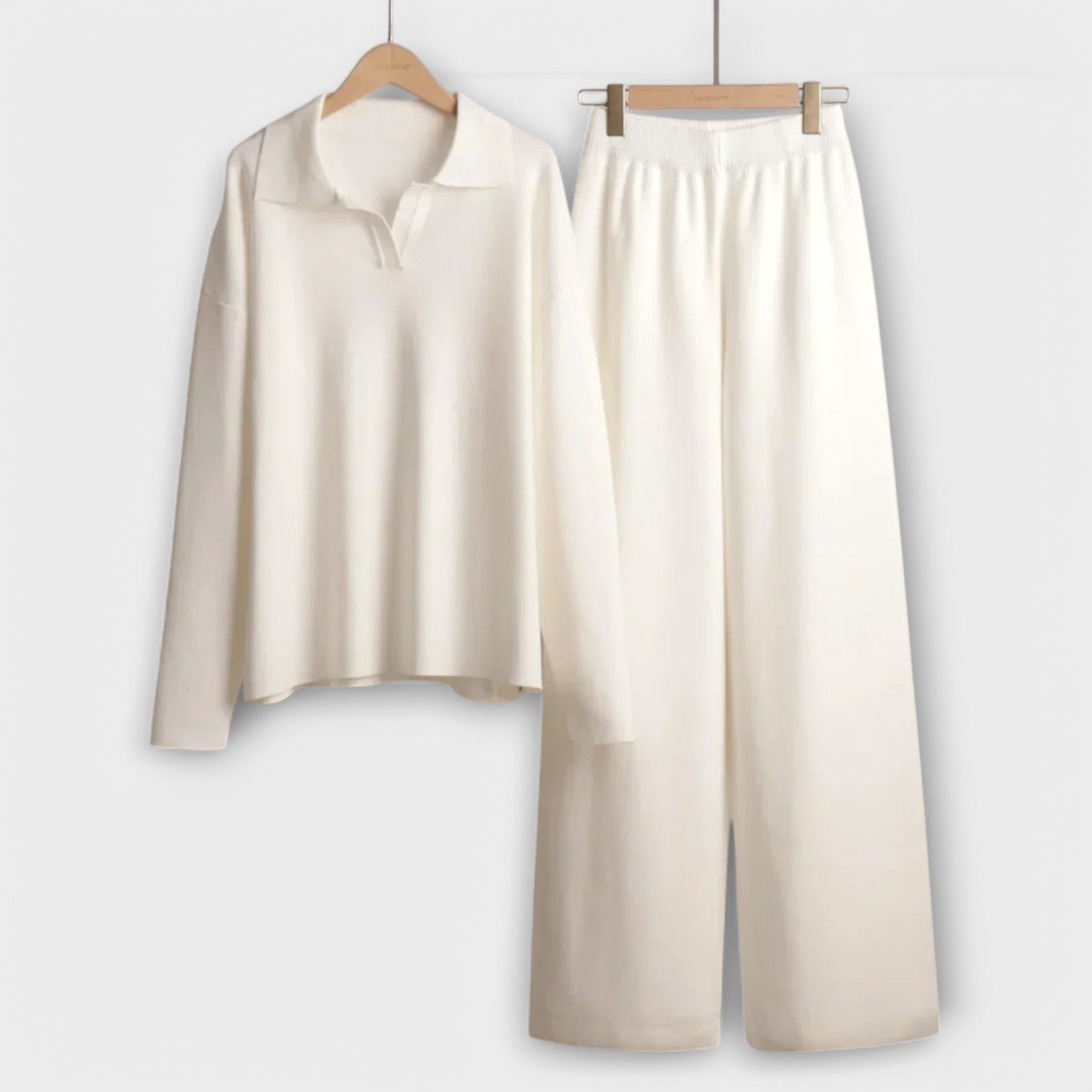 Stylish ladies' knit set consisting of a loose sweater and wide pants. Made from soft, comfortable material that ensures comfort and an elegant appearance. The sweater features slightly dropped shoulders and a delicate collar that adds a modern touch. The wide pants highlight the relaxed, fashionable style, perfect for cooler days. The set is ideal for both everyday looks and more casual outings.
