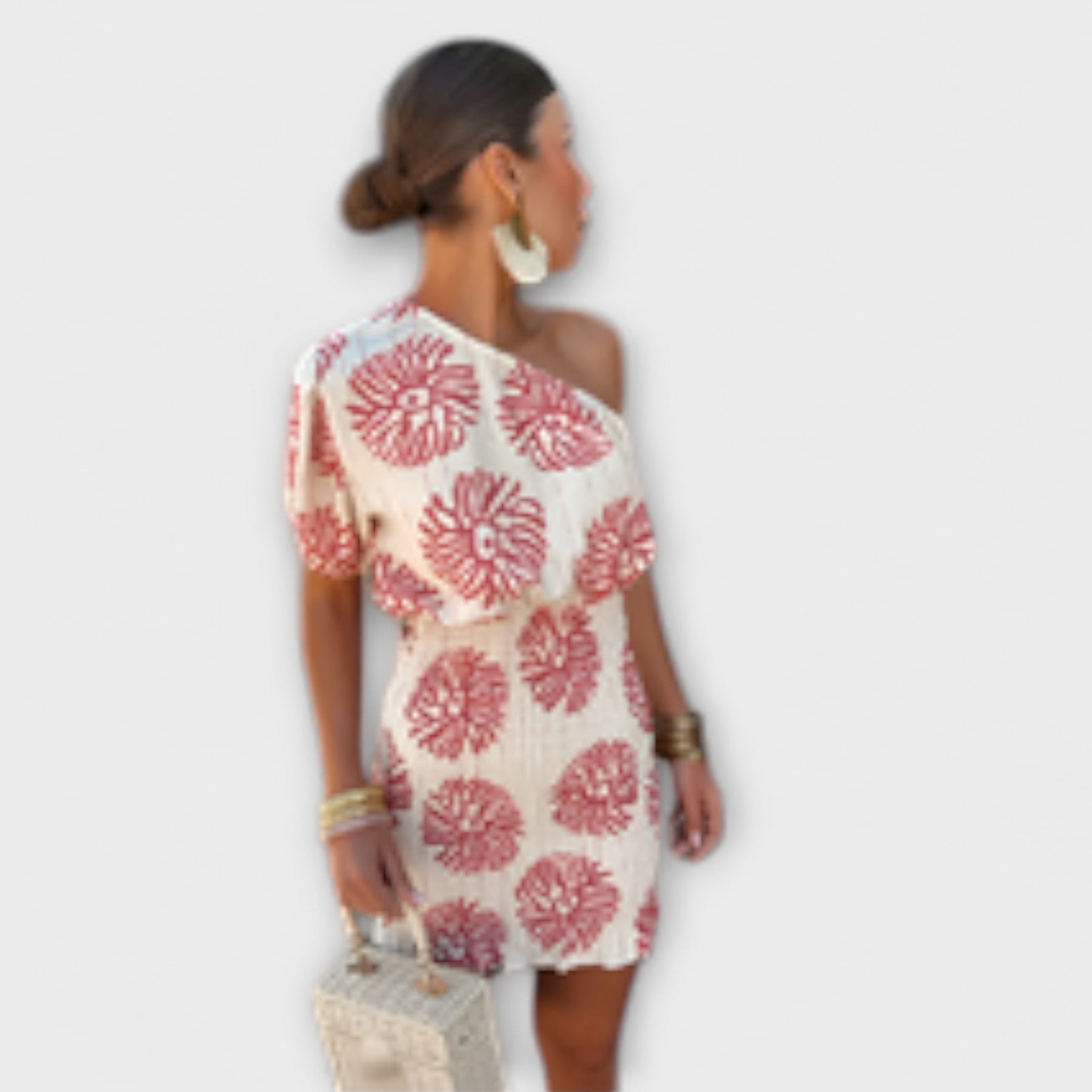 Experience the perfect blend of style and comfort with our Natalie Dress. This stunning one-shoulder design enhances your neckline while keeping it effortlessly chic. The vibrant print captures the essence of summer, making it a must-have for your wardrobe.