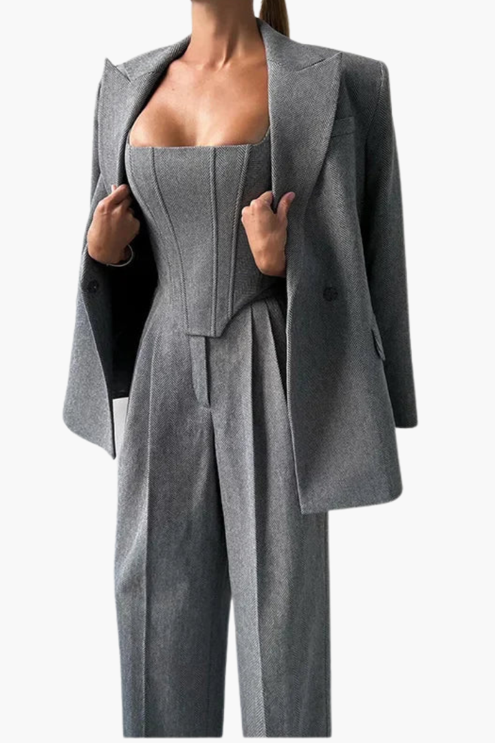 Our popular 3-piece ensemble blends structure, sophistication, and bold femininity—designed to make a lasting impression in any room. With a tailored blazer, contoured corset, and high-waisted trousers, this best-selling power set gives you endless styling potential and a silhouette that exudes strength and grace.