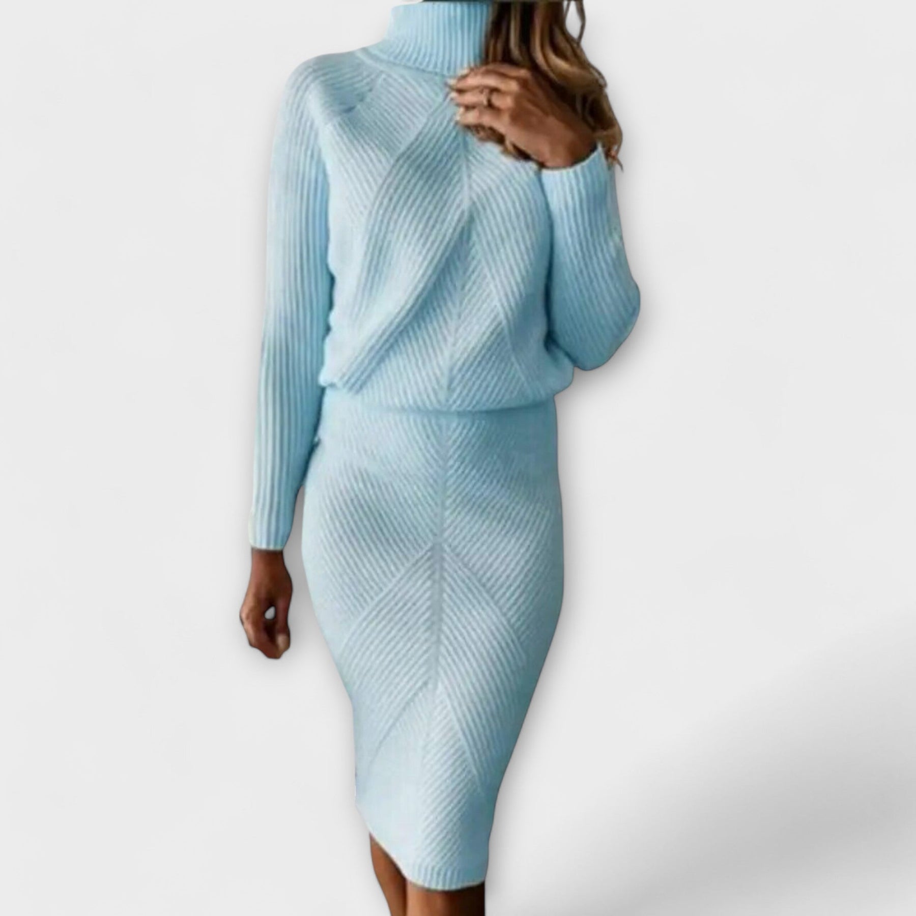 - Design: Turtleneck sweater and fitted skirt